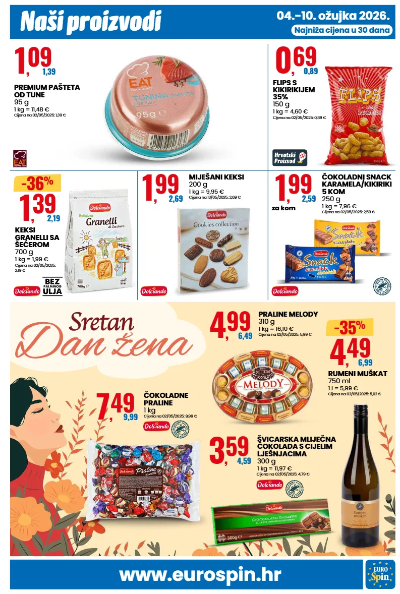 www.eurospin.hr naši proizvodi 04.-10. ožujka 2026. najniža cijena u 30 dana 7 , 49 9,99 čokoladne praline 1 kg cijena na 02/05/2025: 9,99 € 4 , 99 6,49 praline melody 310 g 1 kg = 16,10 € cijena na 02/05/2025: 5,99 € 3 , 59 4,59 švicarska mliječna čokolada s cijelim lješnjacima 300 g 1 kg = 11,97 € cijena na 02/05/2025: 4,79 € 4 , 49 6,99 -35 % rumeni muškat 750 ml 1 l = 5,99 € cijena na 02/05/2025: 5,02 € 1 , 09 1,39 premium pašteta od tune 95 g 1 kg = 11,48 € cijena na 02/05/2025: 1,39 € 0 , 69 0,89 flips s kikirikijem 35% 150 g 1 kg = 4,60 € cijena na 02/05/2025: 0,89 € 1 , 39 2,19 -36 % keksi granelli sa šećerom 700 g 1 kg = 1,99 € cijena na 02/05/2025: 2,19 € 1 , 99 2,69 miješani keksi 200 g 1 kg = 9,95 € cijena na 13/05/2025: 2,69 € 1 , 99 2,59 za kom čokoladni snack karamela/kikiriki 5 kom 250 g 1 kg = 7,96 € cijena na 02/05/2025: 2,59 €