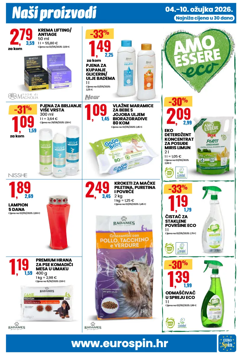 www.eurospin.hr naši proizvodi 04.-10. ožujka 2026. najniža cijena u 30 dana 2 , 79 3,59 za kom krema lifting/ antiage 50 ml 1 l = 55,80 € cijena na 02/05/2025: 3,59 € 1 , 09 1,59 za kom -31 % pjena za brijanje više vrsta 300 ml 1 l = 3,64 € cijena na 29/08/2025: 1,59 € 1 , 89 2,69 lampion 5 dana cijena na 02/05/2025: 2,69 € 1 , 19 1,59 premium hrana za pse komadići mesa u umaku 400 g 1 kg = 2,98 € cijena na 15/10/2025: 1,59 € 2 , 49 3,45 kroketi za mačke piletina, puretina i povrće 2 kg 1 kg = 1,25 € cijena na 02/05/2025: 3,45 € 1 , 49 2,25 za kom -33 % pjena za kupanje glicerin/ ulje badema 1 l cijena na 02/05/2025: 2,25 € 2 , 09 2,99 30% recycled plastic -30 % eko deterdžent koncentrat za posuðe miris limun 2 l 1 l = 1,05 € cijena na 02/05/2025: 2,99 € 1 , 19 1,79 100% recycled plastic -33 % čistač za staklene površine eco 1 l cijena na 02/05/2025: 1,79 € 1 , 39 1,99 100% recycled plastic -30 % odmašćivač u spreju eco 1 l cijena na 02/05/2025: 1,99 € 1 , 09 1,45 vlažne maramice za bebe s jojoba uljem biorazgradive 80 kom cijena na 02/05/2025: 1,45 €