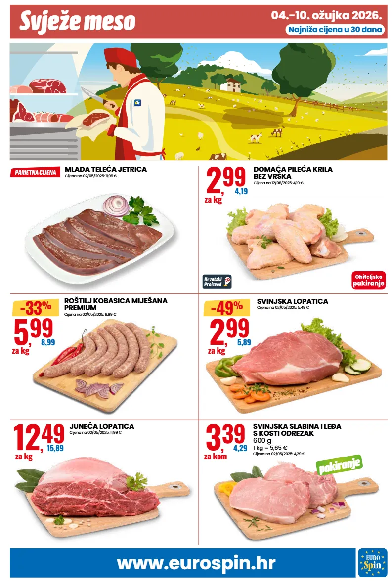 www.eurospin.hr svježe meso 04.-10. ožujka 2026. najniža cijena u 30 dana domaća pileća krila bez vrška cijena na 12/06/2025: 4,19 € 2 , 99 4,19 za kg roštilj kobasica miješana premium cijena na 02/05/2025: 8,99 € 5 , 99 8,99 za kg juneća lopatica cijena na 02/05/2025: 11,99 € 12 , 49 15,89 za kg svinjska slabina i leđa s kosti odrezak 600 g 1 kg = 5,65 € cijena na 02/05/2025: 4,29 € pakiranje 3 , 39 4,29 za kom -33 % svinjska lopatica cijena na 02/05/2025: 5,49 € 2 , 99 5,89 za kg -49 % mlada teleća jetrica cijena na 02/05/2025: 11,99 €