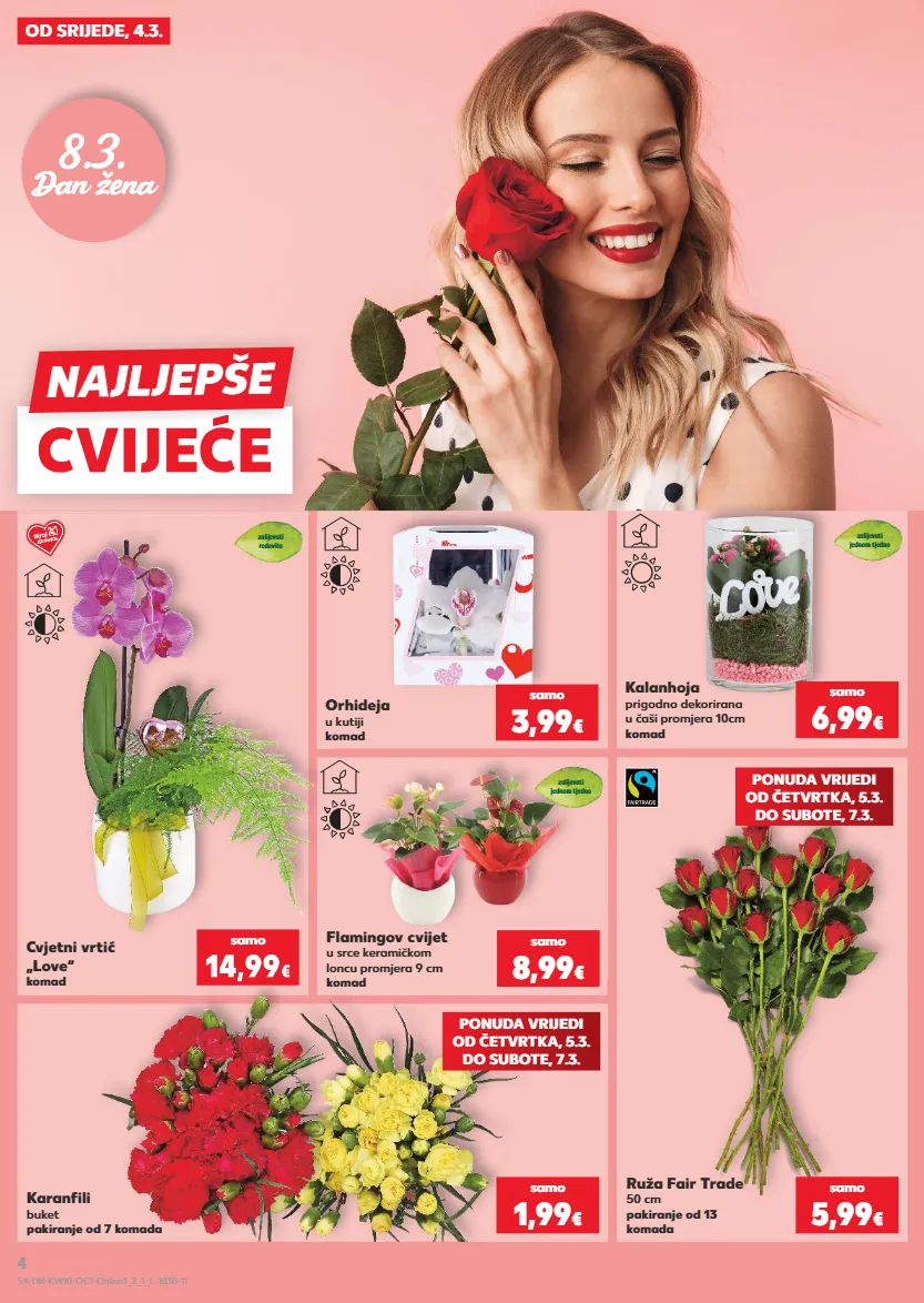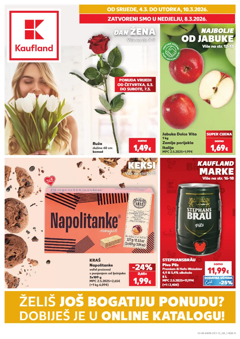 iste cijene na kopnu i na moru! kratkotrajna ponuda kratkotrajna ponuda samo više na str. 4-9 dan žena najbolje od jabuke više na str. 10-11 više na str. 10-11 keksi više na str. 4-9 dan ponuda vrijedi od četvrtka, 5.3. do subote, 7.3. kaufland marke više na str. 12-13 više na str. 16-18 želiš još bogatiju ponudu? dobiješ je u online katalogu! od srijede, 4.3. do utorka, 10.3.2026. zatvoreni smo u nedjelju, 8.3.2026. jabuka dolce vita 1 kg zemlja porijekla italija mpc 2.5.2025=1,99€ super cijena (=1 kg 6,09€) kraš napolitanke vafel proizvod s punjenjem od lješnjaka 3x109 g mpc 2.5.2025=2,65€ -24% ruža dužine 60 cm komad samo 1,69 € 1,99 € 2,65 € samo 1,49 € (=1 l 2,40€) stephansbräu pivo pils premium ili hefe-weissbier 4,9 ili 5,4% alkohola 5 l mpc 2.5.2025=11,99€ samo 11,99 € -25% dodatna ušteda s1-hr-kw10-oc1-ts_ok_1-1030-11