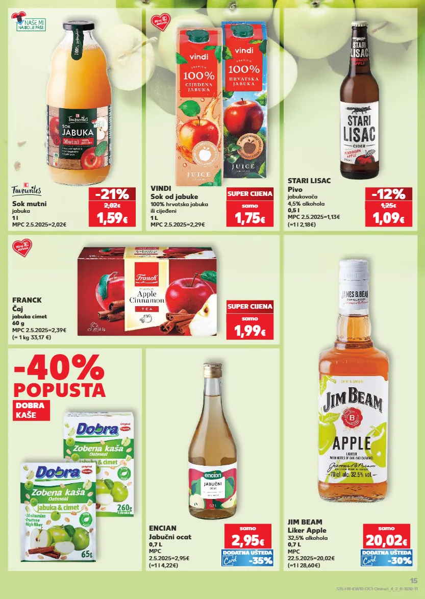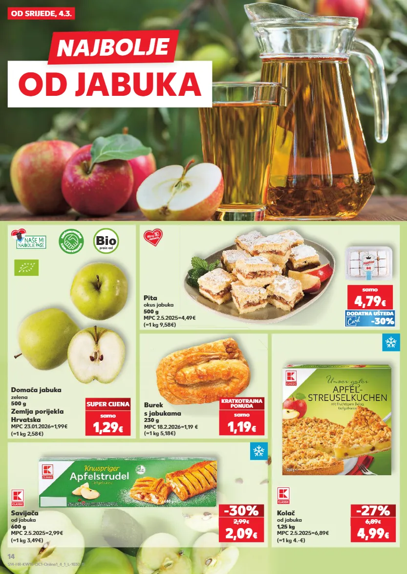 -35% 1,99 € kratkotrajna ponuda kratkotrajna ponuda kratkotrajna ponuda samo samo od srijede, 4.3. savijača od jabuka 600 g mpc 2.5.2025=2,99€ (=1 kg 3,49€) kolač od jabuka 1,25 kg mpc 2.5.2025=6,89€ (=1 kg 4.-€) domaća jabuka zelena 500 g zemlja porijekla hrvatska mpc 23.01.2026=1,99€ (=1 kg 2,58€) -30% super cijena -27% kratkotrajna ponuda (=1 kg 5,18€) burek s jabukama 230 g mpc 18.2.2026=1,19 € 2,09 € 2,99 € samo 1,29 € 4,99 € 6,89 € samo 1,19 € (=1 kg 9,58€) pita okus jabuka 500 g mpc 2.5.2025=4,49€ samo 4,79 € -30% dodatna ušteda k a u f l a n d k v a l i t e t a o b e ć a n j e s v j e ž i n e od jabuka najbolje s14-hr-kw10-oc1-online1_4_1_l-1030-11 14