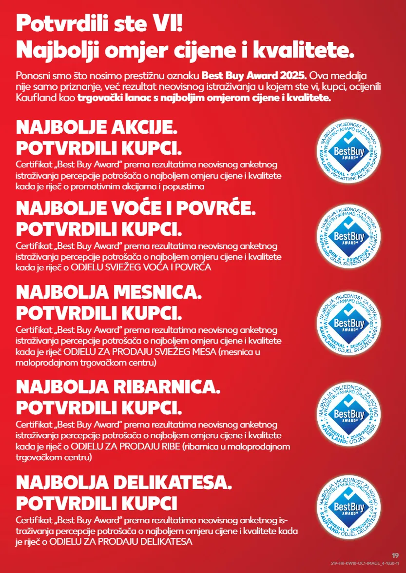 Potvrdili ste VI! Najbolji omjer cijene i kvalitete. Ponosni smo što nosimo prestižnu oznaku Best Buy Award 2025. Ova medalja nije samo priznanje, već rezultat neovisnog istraživanja u kojem ste vi, kupci, ocijenili Kaufland kao trgovački lanac s najboljim omjerom cijene i kvalitete. NAJBOLJE AKCIJE. POTVRDILI KUPCI. Certifikat „Best Buy Award“ prema rezultatima neovisnog anketnog istraživanja percepcije potrošača o najboljem omjeru cijene i kvalitete kada je riječ o promotivnim akcijama i popustima NAJBOLJE VOĆE I POVRĆE. POTVRDILI KUPCI. Certifikat „Best Buy Award“ prema rezultatima neovisnog anketnog istraživanja percepcije potrošača o najboljem omjeru cijene i kvalitete kada je riječ o ODJELU SVJEŽEG VOĆA I POVRĆA NAJBOLJA MESNICA. POTVRDILI KUPCI. Certifikat „Best Buy Award“ prema rezultatima neovisnog anketnog istraživanja percepcije potrošača o najboljem omjeru cijene i kvalitete kada je riječ ODJELU ZA PRODAJU SVJEŽEG MESA (mesnica u maloprodajnom trgovačkom centru) NAJBOLJA RIBARNICA. POTVRDILI KUPCI. Certifikat „Best Buy Award“ prema rezultatima neovisnog anketnog istraživanja percepcije potrošača o najboljem omjeru cijene i kvalitete kada je riječ o ODJELU ZA PRODAJU RIBE (ribarnica u maloprodajnom trgovačkom centru) NAJBOLJA DELIKATESA. POTVRDILI KUPCI Certifikat „Best Buy Award“ prema rezultatima neovisnog anketnog is- traživanja percepcije potrošača o najboljem omjeru cijene i kvalitete kada je riječ o ODJELU ZA PRODAJU DELIKATESA S19-HR-KW10-OC1-IMAGE_4-1030-11 19
