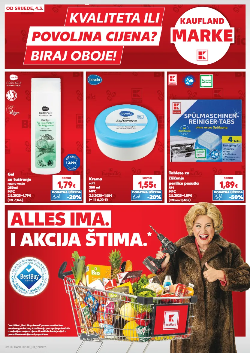 ALLES IMA. I AKCIJA ŠTIMA. * MARKE BIRAJ OBOJE! KVALITETA ILI POVOLJNA CIJENA? OD SRIJEDE, 4.3. (=1l 7,16€) Gel za tuširanje razne vrste 250ml MPC 2.5.2025=1,79€ (=1kom 0,48€) Tablete za čišćenje perilice posuđa 4/1 MPC 2.5.2025=1,89€ samo 1,79 € samo 1,89 € (= 1 l 6,20 €) Krema soft 250 ml MPC 2.5.2025=1,55€ samo 1,55 € 2,99 € -20% DODATNA UŠTEDA -20% DODATNA UŠTEDA -50% DODATNA UŠTEDA *certifikat „Best Buy Award“ prema rezultatima neovisnog anketnog istraživanja percepcije potrošača o najboljem omjeru cijene i kvalitete kada je riječ o promotivnim akcijama i popustima S22-HR-KW10-OC1-RS_OK_1-1030-11