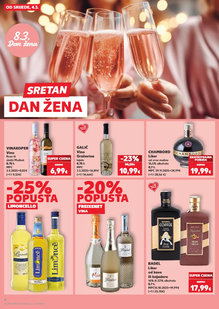 kratkotrajna ponuda kratkotrajna ponuda samo kratkotrajna ponuda od srijede, 4.3. vinakoper vino rose ili slatki muškat 0,75 l mpc 2.5.2025=8,02€ (=1 l 9,32€) galić vino graševina bijelo 0,75 l mpc 2.5.2025=16,89€ (=1 l 14,66€) super cijena -23% samo 6,99 € 10,99 € badel liker od kave ili bajadere 16% ili 22% alkohola 0,7 l mpc15.10.2025=19,99€ (=1 l 25,70€) super cijena samo 17,99 € chambord liker od crne maline 16,5% alkohola 0,7 l mpc 29.11.2025=24,99€ (=1 l 28,56 €) kratkotrajna ponuda samo 19,99 € 14,29 € -20% popusta freixenet vina -25% popusta limoncello 8.3. dan žena dan žena dan žena dan žena sretan s6-hr-kw10-oc1-online1_2_3_l-1030-11 6