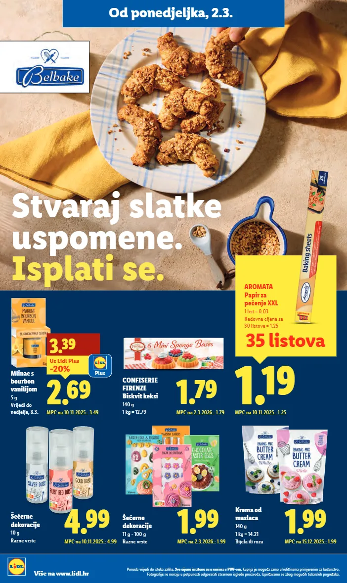 stvaraj slatke uspomene. isplati se. 1.19 aromata papir za pečenje xxl 1 list = 0.03 redovna cijena za 30 listova = 1.25 mpc na 10.11.2025.: 1.25 35 listova 1.99 mpc na 15.12.2025.: 1.99 krema od maslaca 140 g 1 kg = 14.21 bijela ili roza 1.79 mpc na 2.3.2026.: 1.79 confiserie firenze biskvit keksi 140 g 1 kg = 12.79 mlinac s bourbon vanilijom 5 g vrijedi do nedjelje, 8.3. 2.69 3.39 mpc na 10.11.2025.: 3.49 -20% uz lidl plus 1.99 mpc na 2.3.2026.: 1.99 šećerne dekoracije 10 g razne vrste šećerne dekoracije 11 g - 100 g razne vrste 4.99 mpc na 10.11.2025.: 4.99 ponuda vrijedi do isteka zaliha. sve cijene izražene su u eurima s pdv-om. kupnja je moguća samo u količinama primjerenim za kućanstvo. fotografije ne moraju u potpunosti odgovarati stvarnom izgledu proizvoda. ispričavamo se zbog mogućih tiskarskih pogrešaka. više na www.lidl.hr od ponedjeljka, 2.3.