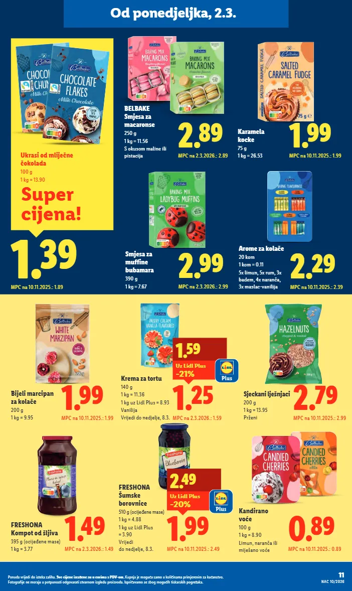 smjesa za muffine bubamara 390 g 1 kg = 7.67 freshona kompot od šljiva 395 g (ocijeđene mase) 1 kg = 3.77 1.99 mpc na 10.11.2025.: 1.99 bijeli marcipan za kolače 200 g 1 kg = 9.95 1.99 mpc na 10.11.2025.: 1.99 karamela kocke 75 g 1 kg = 26.53 freshona šumske borovnice 510 g (ocijeđene mase) 1 kg = 4.88 1 kg uz lidl plus = 3.90 vrijedi do nedjelje, 8.3. 1.99 2.49 mpc na 10.11.2025.: 2.49 -20% uz lidl plus krema za tortu 140 g 1 kg = 11.36 1 kg uz lidl plus = 8.93 vanilija vrijedi do nedjelje, 8.3. 1.25 1.59 mpc na 2.3.2026.: 1.59 -21% uz lidl plus belbake smjesa za macaronse 250 g 1 kg = 11.56 s okusom maline ili pistacija 2.89 mpc na 2.3.2026.: 2.89 2.99 mpc na 2.3.2026.: 2.99 2.29 mpc na 10.11.2025.: 2.39 arome za kolače 20 kom 1 kom = 0.11 5x limun, 5x rum, 3x badem, 4x naranča, 3x maslac-vanilija 0.89 mpc na 10.11.2025.: 0.89 kandirano voće 100 g 1 kg = 8.90 limun, naranča ili miješano voće 1.49 mpc na 2.3.2026.: 1.49 1.39 mpc na 10.11.2025.: 1.89 super cijena! ukrasi od mliječne čokolada 100 g 1 kg = 13.90 2.79 mpc na 10.11.2025.: 2.99 sjeckani lješnjaci 200 g 1 kg = 13.95 prženi 11 nac 10/2026 ponuda vrijedi do isteka zaliha. sve cijene izražene su u eurima s pdv-om. kupnja je moguća samo u količinama primjerenim za kućanstvo. fotografije ne moraju u potpunosti odgovarati stvarnom izgledu proizvoda. ispričavamo se zbog mogućih tiskarskih pogrešaka. od ponedjeljka, 2.3.