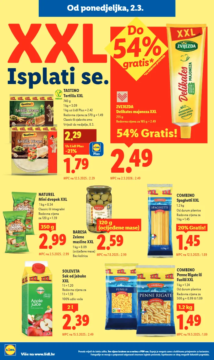 xxl isplati se. 2.59 320 g (ocijeđene mase) mpc na 7.8.2025.: 2.99 baresa zelene masline xxl 1 kg = 8.09 (ocijeđene mase) bez koštica combino penne rigate ili fusilli xxl 1 kg = 1.24 od durum pšenice redovna cijena za 500 g = 0.99 ili 1.09 combino spaghetti xxl 1.2 kg od durum pšenice redovna cijena za 1 kg = 1.45 1.49 1.2 kg mpc na 19.5.2025.: 1.89 1.45 20% gratis! mpc na 12.5.2025.: 1.89 2.39 2 l mpc na 15.5.2025.: 2.49 solevita sok od jabuke xxl 1 l = 1.20 redovna cijena za 1 l = 1.59 100% udio voća tastino tortilla xxl 740 g 1 kg = 3.09 1 kg uz lidl plus = 2.42 redovna cijena za 370 g = 1.49 classic ili cjelovito zrno vrijedi do nedjelje, 8.3. 1.79 2.29 mpc na 12.5.2025.: 2.29 -21% uz lidl plus 2.49 zvijezda delikates majoneza xxl 255 g redovna cijena za 165 g = 2.49 mpc na 2.3.2026.: 2.49 54% gratis! do 54% gratis* *na odabrane proizvode naturel mini dvopek xxl 1 kg = 8.54 classic ili integralni redovna cijena za 120 g = 1.39 2.99 350 g mpc na 2.5.2025.: 2.99 od ponedjeljka, 2.3. ponuda vrijedi do isteka zaliha. sve cijene izražene su u eurima s pdv-om. kupnja je moguća samo u količinama primjerenim za kućanstvo. fotografije ne moraju u potpunosti odgovarati stvarnom izgledu proizvoda. ispričavamo se zbog mogućih tiskarskih pogrešaka. više na www.lidl.hr