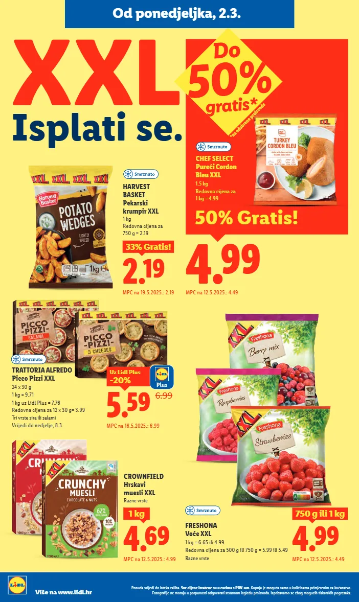 xxl isplati se. 2.19 33% gratis! mpc na 19.5.2025.: 2.19 harvest basket pekarski krumpir xxl 1 kg redovna cijena za 750 g = 2.19 4.99 mpc na 12.5.2025.: 4.49 50% gratis! chef select p ureći cordon bleu xxl 1.5 kg redovna cijena za 1 kg = 4.99 freshona voće xxl 1 kg = 6.65 ili 4.99 redovna cijena za 500 g ili 750 g = 5.99 ili 5.49 razne vrste 4.99 750 g ili 1 kg mpc na 12.5.2025.: 4.49 4.69 1 kg mpc na 12.5.2025.: 4.99 crownfield hrskavi muesli xxl razne vrste trattoria alfredo picco pizzi xxl 24 x 30 g 1 kg = 9.71 1 kg uz lidl plus = 7.76 redovna cijena za 12 x 30 g= 3.99 tri vrste sira ili salami vrijedi do nedjelje, 8.3. 6.99 5.59 -20% uz lidl plus mpc na 16.5.2025.: 6.99 do 50% gratis* *na odabrane proizvode od ponedjeljka, 2.3. ponuda vrijedi do isteka zaliha. sve cijene izražene su u eurima s pdv-om. kupnja je moguća samo u količinama primjerenim za kućanstvo. fotografije ne moraju u potpunosti odgovarati stvarnom izgledu proizvoda. ispričavamo se zbog mogućih tiskarskih pogrešaka. više na www.lidl.hr