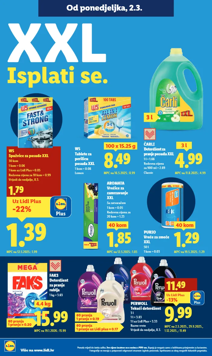 aromata vrećice za zamrzavanje xxl sa zatvaračem 1 kom = 0.05 redovna cijena za 20 kom = 1.23 1.85 40 kom mpc na 12.5.2025.: 1.85 purio vreće za smeće xxl 50 l 1 kom = 0.03 1.29 40 kom mpc na 19.5.2025.: 1.29 w5 tablete za perilicu posuđa xxl 1 kom = 0.08 lemon 8.49 100 x 15.25 g mpc na 16.5.2025.: 8.99 čarli deterdžent za pranje posuđa xxl 1 l = 1.66 redovna cijena za 900 ml = 2.69 classic 3 l xxl isplati se. uz lidl plus -22% 1.39 mpc na 12.5.2025.: 1.99 1.79 w5 spužvice za posuđe xxl 30 kom 1 kom = 0.06 1 kom uz lidl plus = 0.05 redovna cijena za 10 kom = 0.99 vrijedi do nedjelje, 8.3. 80 pranja 1 pranje = 0.20 perwoll tekući deterdžent 3 l 1 l = 3.83 1 l uz lidl plus = 3.33 razne vrste vrijedi do nedjelje, 8.3. 15.99 4.4 kg mpc na 19.1.2026.: 15.99 faks deterdžent za pranje rublja 1 kg = 3.63 60 pranja 1 pranje = 0.19 4.99 mpc na 11.8.2025.: 4.99 3 l 9.99 11.49 mpc na 2.5.2025., 29.9.2025., 1.12.2025.,: 11.49 -13% uz lidl plus 60 pranja 1 pranje uz lidl plus = 0.17 ponuda vrijedi do isteka zaliha. sve cijene izražene su u eurima s pdv-om. kupnja je moguća samo u količinama primjerenim za kućanstvo. fotografije ne moraju u potpunosti odgovarati stvarnom izgledu proizvoda. ispričavamo se zbog mogućih tiskarskih pogrešaka. više na www.lidl.hr od ponedjeljka, 2.3.