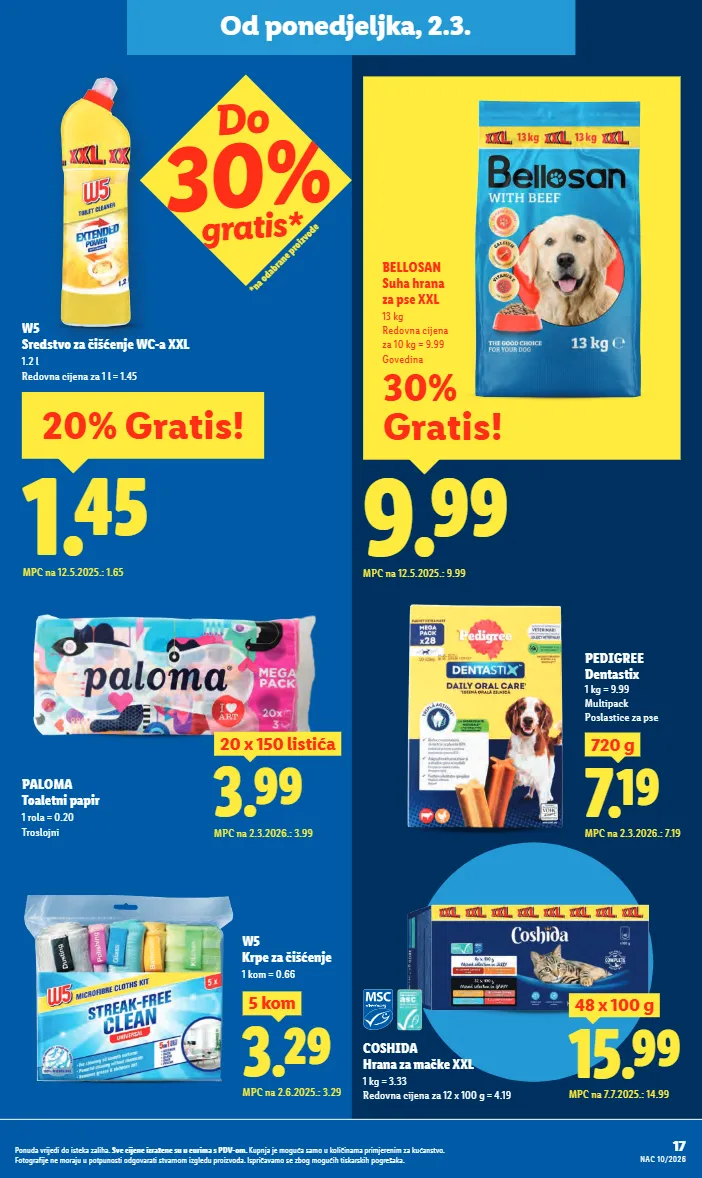 w5 sredstvo za čišćenje wc-a xxl 1.2 l redovna cijena za 1 l = 1.45 1.45 mpc na 12.5.2025.: 1.65 20% gratis! 15.99 48 x 100 g mpc na 7.7.2025.: 14.99 coshida hrana za mačke xxl 1 kg = 3.33 redovna cijena za 12 x 100 g = 4.19 9.99 bellosan suha hrana za pse xxl 13 kg redovna cijena za 10 kg = 9.99 govedina mpc na 12.5.2025.: 9.99 30% gratis! 3.29 5 kom mpc na 2.6.2025.: 3.29 w5 krpe za čišćenje 1 kom = 0.66 7.19 720 g mpc na 2.3.2026.: 7.19 pedigree dentastix 1 kg = 9.99 multipack poslastice za pse do 30% gratis* *na odabrane proizvode 3.99 20 x 150 listića mpc na 2.3.2026.: 3.99 paloma toaletni papir 1 rola = 0.20 troslojni 17 nac 10/2026 ponuda vrijedi do isteka zaliha. sve cijene izražene su u eurima s pdv-om. kupnja je moguća samo u količinama primjerenim za kućanstvo. fotografije ne moraju u potpunosti odgovarati stvarnom izgledu proizvoda. ispričavamo se zbog mogućih tiskarskih pogrešaka. od ponedjeljka, 2.3.