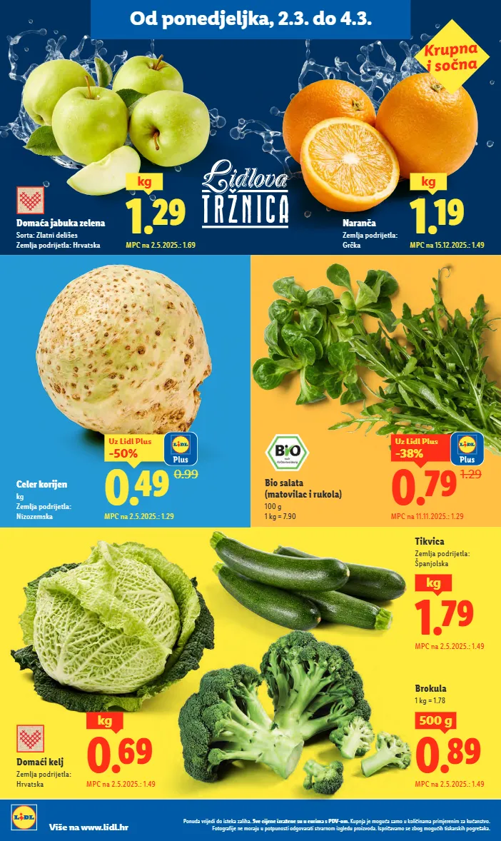 ponuda vrijedi do isteka zaliha. sve cijene izražene su u eurima s pdv-om. kupnja je moguća samo u količinama primjerenim za kućanstvo. fotografije ne moraju u potpunosti odgovarati stvarnom izgledu proizvoda. ispričavamo se zbog mogućih tiskarskih pogrešaka. više na www.lidl.hr od ponedjeljka, 2.3. do 4.3. mpc na 11.11.2025.: 1.29 1.29 0.79 -38% uz lidl plus bio salata (matovilac i rukola) 100 g 1 kg = 7.90 mpc na 2.5.2025.: 1.29 0.99 0.49 -50% uz lidl plus celer korijen kg zemlja podrijetla: nizozemska naranča zemlja podrijetla: grčka 1.19 kg mpc na 15.12.2025.: 1.49 domaća jabuka zelena sorta: zlatni delišes zemlja podrijetla: hrvatska 1.29 kg mpc na 2.5.2025.: 1.69 domaći kelj zemlja podrijetla: hrvatska 0.69 kg mpc na 2.5.2025.: 1.49 tikvica zemlja podrijetla: španjolska 1.79 kg mpc na 2.5.2025.: 1.49 brokula 1 kg = 1.78 0.89 500 g mpc na 2.5.2025.: 1.49 krupna i sočna
