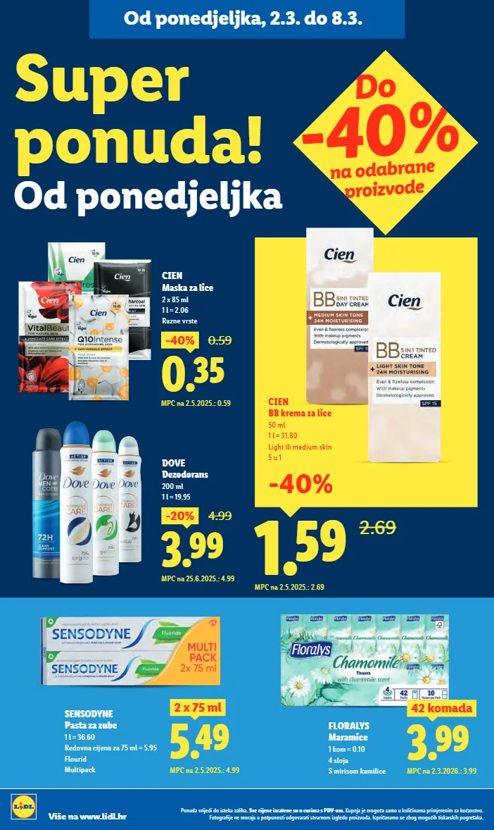 do -40% na odabrane proizvode 0.35 -40% 0.59 mpc na 2.5.2025.: 0.59 cien maska za lice 2 x 85 ml 1 l = 2.06 razne vrste 1.59 2.69 cien bb krema za lice 50 ml 1 l = 31.80 light ili medium skin 5 u 1 mpc na 2.5.2025.: 2.69 -40% 3.99 -20% 4.99 mpc na 25.6.2025.: 4.99 dove dezodorans 200 ml 1 l = 19.95 floralys maramice 1 kom = 0.10 4 sloja s mirisom kamilice 5.49 2 x 75 ml mpc na 2.5.2025.: 4.99 sensodyne pasta za zube 1 l = 36.60 redovna cijena za 75 ml = 5.95 flourid multipack 3.99 42 komada mpc na 2.3.2026.: 3.99 ponuda vrijedi do isteka zaliha. sve cijene izražene su u eurima s pdv-om. kupnja je moguća samo u količinama primjerenim za kućanstvo. fotografije ne moraju u potpunosti odgovarati stvarnom izgledu proizvoda. ispričavamo se zbog mogućih tiskarskih pogrešaka. više na www.lidl.hr super ponuda! od ponedjeljka od ponedjeljka, 2.3. do 8.3.