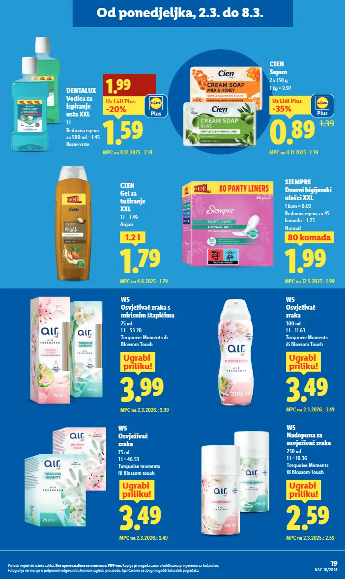 3.49 ugrabi priliku! mpc na 2.3.2026.: 3.49 w5 o svježivač zraka 75 ml 1 l = 46.53 turquoise moments ili blossom touch w5 o svježivač zraka 300 ml 1 l = 11.63 torquoise moments ili blossom touch 3.99 ugrabi priliku! mpc na 2.3.2026.: 3.99 w5 osvježivač zraka s mirisnim štapićima 75 ml 1 l = 53.20 torquoise moments ili blossom touch 2.59 ugrabi priliku! mpc na 2.3.2025.: 2.59 w5 nadopuna za osvježivač zraka 250 ml 1 l = 10.36 torquoise moments ili blossom touch 3.49 ugrabi priliku! mpc na 2.3.2026.: 3.49 1.39 0.89 -35% uz lidl plus mpc na 4.11.2025.: 1.39 cien s apun 2 x 150 g 1 kg = 2.97 dentalux vodica za ispiranje usta xxl 1 l redovna cijena za 500 ml = 1.45 razne vrste 1.59 1.99 mpc na 8.12.2025.: 2.19 -20% uz lidl plus 1.79 1.2 l mpc na 4.8.2025.: 1.79 cien gel za tuširanje xxl 1 l = 1.49 argan siempre dnevni higijenski ulošci xxl 1 kom = 0.02 redovna cijena za 45 komada = 1.25 normal 1.99 80 komada mpc na 12.5.2025.: 1.99 19 nac 10/2026 ponuda vrijedi do isteka zaliha. sve cijene izražene su u eurima s pdv-om. kupnja je moguća samo u količinama primjerenim za kućanstvo. fotografije ne moraju u potpunosti odgovarati stvarnom izgledu proizvoda. ispričavamo se zbog mogućih tiskarskih pogrešaka. od ponedjeljka, 2.3. do 8.3.