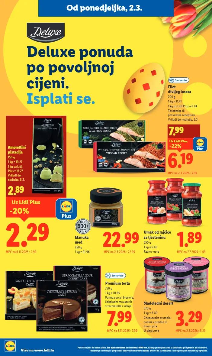deluxe ponuda po povoljnoj cijeni. isplati se. filet divljeg lososa 700 g 1 kg = 11.41 1 kg uz lidl plus = 8.84 toskanska ili provanska receptura vrijedi do nedjelje, 8.3. 22.99 mpc na 2.3.2026.: 22.99 manuka med 250 g 1 kg = 91.96 1.89 mpc na 7.7.2025.: 1.69 umak od rajčice za tjesteninu 350 g 1 kg = 5.40 razne vrste 7.99 mpc na 6.11.2025.: 7.99 premium torta 750 g 1 kg = 10.65 panna cotta i breskva, čokoladni mousse ili stracciatella i višnja 3.29 mpc na 2.3.2026.: 3.29 sladoledni desert 370 g 1 kg = 8.89 cheesecake crumble, cookie crumble ili limun pita u slojevima 6.19 7.99 mpc na 2.3.2026.: 7.99 -22% uz lidl plus uz lidl plus -20% 2.29 mpc na 6.11.2025.: 2.99 amorettini pistacija 150 g 1 kg = 19.27 1 kg uz lidl plus = 15.27 vrijedi do nedjelje, 8.3. 2.89 ponuda vrijedi do isteka zaliha. sve cijene izražene su u eurima s pdv-om. kupnja je moguća samo u količinama primjerenim za kućanstvo. fotografije ne moraju u potpunosti odgovarati stvarnom izgledu proizvoda. ispričavamo se zbog mogućih tiskarskih pogrešaka. više na www.lidl.hr od ponedjeljka, 2.3.