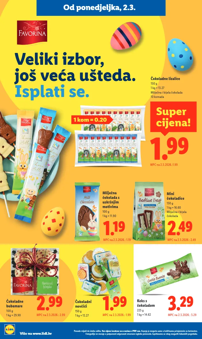 Veliki izbor, još veća ušteda. Isplati se. 2.49 MPC na 2.3.2026.: 2.49 Mini čokoladice 150 g 1 kg = 16.60 Mliječna i bijela čokolada 3.29 MPC na 2.3.2026.: 3.29 Keks s čokoladom 225 g 1 kg = 14.62 Čokoladne lizalice 150 g 1 kg = 13.27 Mliječna i bijela čokolada 10 komada 1.99 MPC na 2.3.2026.:1.99 Super cijena! 2.99 MPC na 2.3.2026.: 2.99 Čokoladne bubamare 100 g 1 kg = 29.90 1 kom = 0.20 1.19 MPC na 2.3.2026.: 1.19 Mliječna čokolada s uskršnjim motivima 100 g 1 kg = 11.90 1.99 MPC na 2.3.2026.: 1.99 Čokoladni novčići 150 g 1 kg = 13.27 Ponuda vrijedi do isteka zaliha. Sve cijene izražene su u eurima s PDV-om. Kupnja je moguća samo u količinama primjerenim za kućanstvo. Fotografije ne moraju u potpunosti odgovarati stvarnom izgledu proizvoda. Ispričavamo se zbog mogućih tiskarskih pogrešaka. Više na www.lidl.hr Od ponedjeljka, 2.3.