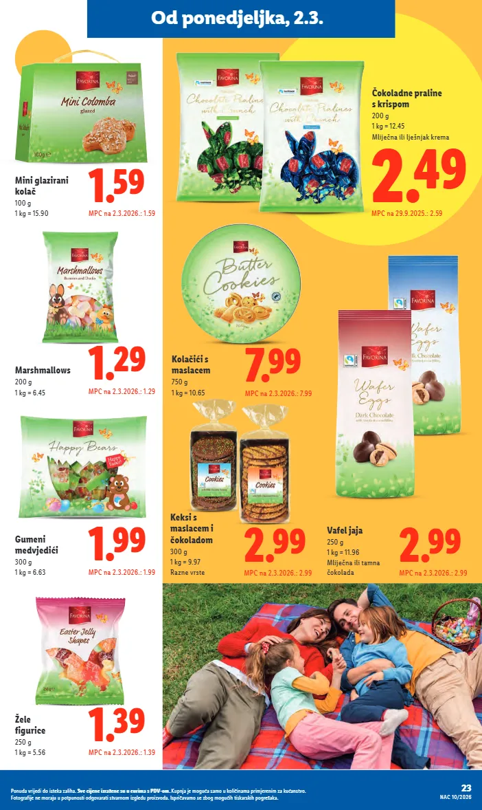čokoladne praline s krispom 200 g 1 kg = 12.45 mliječna ili lješnjak krema 1.99 mpc na 2.3.2026.: 1.99 gumeni medvjedići 300 g 1 kg = 6.63 2.99 mpc na 2.3.2026.: 2.99 vafel jaja 250 g 1 kg = 11.96 mliječna ili tamna čokolada 1.59 mpc na 2.3.2026.: 1.59 mini glazirani kolač 100 g 1 kg = 15.90 1.39 mpc na 2.3.2026.: 1.39 žele figurice 250 g 1 kg = 5.56 1.29 mpc na 2.3.2026.: 1.29 marshmallows 200 g 1 kg = 6.45 2.99 mpc na 2.3.2026.: 2.99 keksi s maslacem i čokoladom 300 g 1 kg = 9.97 razne vrste 7.99 mpc na 2.3.2026.: 7.99 kolačići s maslacem 750 g 1 kg = 10.65 2.49 mpc na 29.9.2025.: 2.59 23 nac 10/2026 ponuda vrijedi do isteka zaliha. sve cijene izražene su u eurima s pdv-om. kupnja je moguća samo u količinama primjerenim za kućanstvo. fotografije ne moraju u potpunosti odgovarati stvarnom izgledu proizvoda. ispričavamo se zbog mogućih tiskarskih pogrešaka. od ponedjeljka, 2.3.