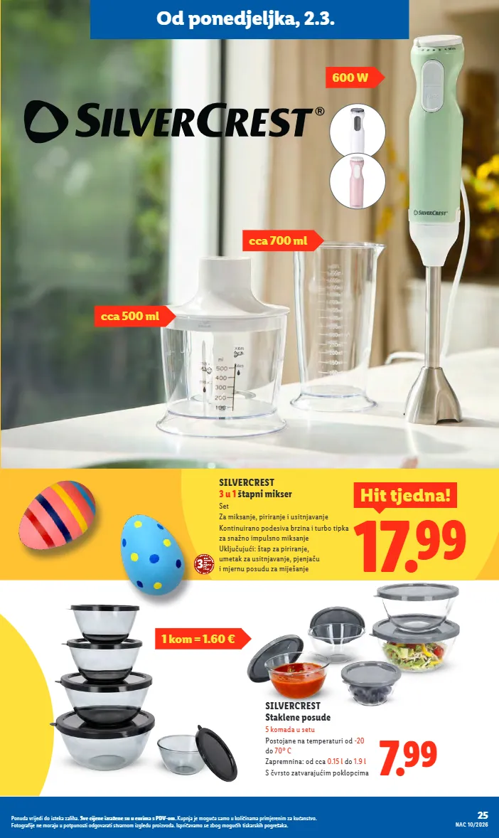 od ponedjeljka, 2.3. cca 500 ml cca 700 ml 600 w silvercrest 3 u 1 štapni mikser set za miksanje, piriranje i usitnjavanje kontinuirano podesiva brzina i turbo tipka za snažno impulsno miksanje uključujući: štap za piriranje, umetak za usitnjavanje, pjenjaču i mjernu posudu za miješanje 17.99 hit tjedna! 7.99 silvercrest staklene posude 5 komada u setu postojane na temperaturi od -20 do 70° c zapremnina: od cca 0.15 l do 1.9 l s čvrsto zatvarajućim poklopcima 1 kom = 1.60 € 25 nac 10/2026 ponuda vrijedi do isteka zaliha. sve cijene izražene su u eurima s pdv-om. kupnja je moguća samo u količinama primjerenim za kućanstvo. fotografije ne moraju u potpunosti odgovarati stvarnom izgledu proizvoda. ispričavamo se zbog mogućih tiskarskih pogrešaka.