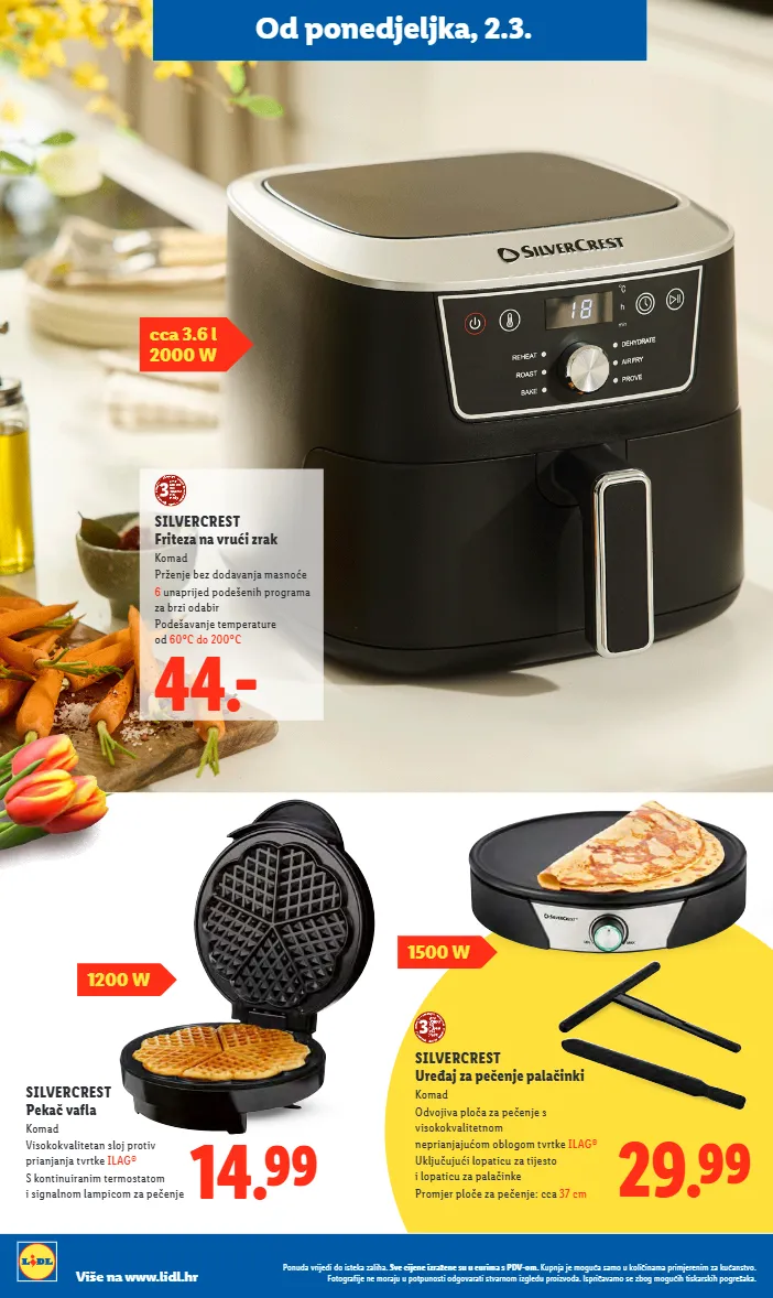 29.99 silvercrest uređaj za pečenje palačinki komad odvojiva ploča za pečenje s visokokvalitetnom neprianjajućom oblogom tvrtke ilag® uključujući lopaticu za tijesto i lopaticu za palačinke promjer ploče za pečenje: cca 37 cm 14.99 silvercrest pekač vafla komad visokokvalitetan sloj protiv prianjanja tvrtke ilag® s kontinuiranim termostatom i signalnom lampicom za pečenje 1200 w od ponedjeljka, 2.3. 44.- silvercrest friteza na vrući zrak komad prženje bez dodavanja masnoće 6 unaprijed podešenih programa za brzi odabir podešavanje temperature od 60°c do 200°c cca 3.6 l 2000 w 1500 w ponuda vrijedi do isteka zaliha. sve cijene izražene su u eurima s pdv-om. kupnja je moguća samo u količinama primjerenim za kućanstvo. fotografije ne moraju u potpunosti odgovarati stvarnom izgledu proizvoda. ispričavamo se zbog mogućih tiskarskih pogrešaka. više na www.lidl.hr
