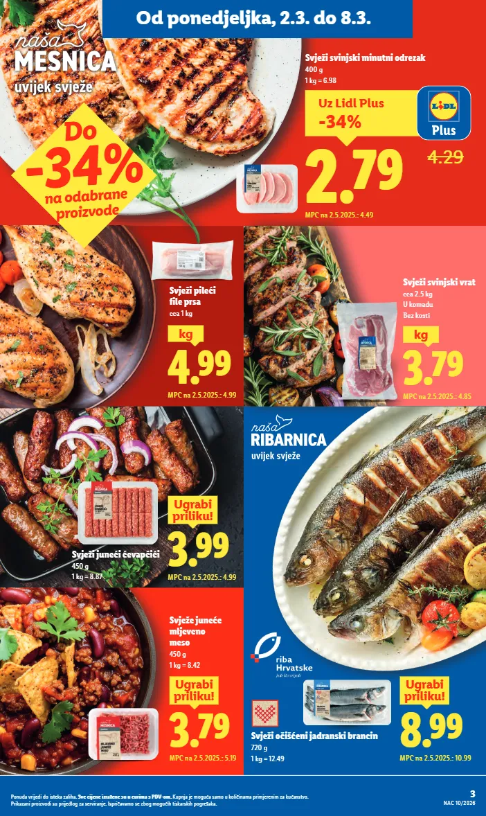 svježi juneći ćevapčići 450 g 1 kg = 8.87 od ponedjeljka, 2.3. do 8.3. svježi svinjski vrat cca 2.5 kg u komadu bez kosti 3.79 kg mpc na 2.5.2025.: 4.85 8.99 ugrabi priliku! mpc na 2.5.2025.: 10.99 3.99 ugrabi priliku! mpc na 2.5.2025.: 4.99 4.99 kg mpc na 2.5.2025.: 4.99 svježi očišćeni jadranski brancin 720 g 1 kg = 12.49 svježe juneće mljeveno meso 450 g 1 kg = 8.42 svježi svinjski minutni odrezak 400 g 1 kg = 6.98 3.79 ugrabi priliku! mpc na 2.5.2025.: 5.19 uz lidl plus -34% 2.79 4.29 mpc na 2.5.2025.: 4.49 svježi pileći file prsa cca 1 kg do -34% na odabrane proizvode 3 nac 10/2026 ponuda vrijedi do isteka zaliha. sve cijene izražene su u eurima s pdv-om. kupnja je moguća samo u količinama primjerenim za kućanstvo. prikazani proizvodi su prijedlog za serviranje. ispričavamo se zbog mogućih tiskarskih pogrešaka.