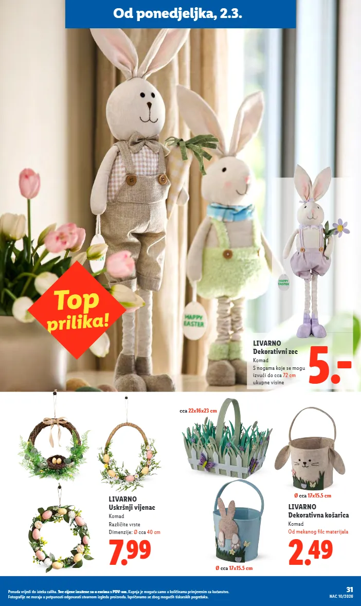 Top prilika ! LIVARNO Dekorativni zec Komad S nogama koje se mogu izvući do cca 72 cm ukupne visine 7.99 LIVARNO Uskršnji vijenac Komad Različite vrste Dimenzije: Ø cca 40 cm 2.49 LIVARNO Dekorativna košarica Komad Od mekanog filc materijala Od ponedjeljka, 2.3. Ø cca 17x15.5 cm Ø cca 17x15.5 cm cca 22x16x23 cm 5.- 31 NAC 10/2026 Ponuda vrijedi do isteka zaliha. Sve cijene izražene su u eurima s PDV-om. Kupnja je moguća samo u količinama primjerenim za kućanstvo. Fotografije ne moraju u potpunosti odgovarati stvarnom izgledu proizvoda. Ispričavamo se zbog mogućih tiskarskih pogrešaka.
