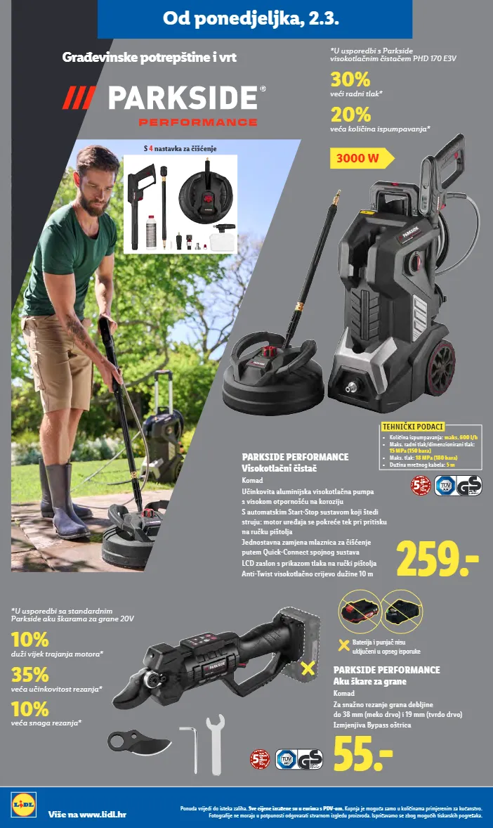 parkside performance aku škare za grane komad za snažno rezanje grana debljine do 38 mm (meko drvo) i 19 mm (tvrdo drvo) izmjenjiva bypass oštrica 55.- baterija i punjač nisu uključeni u opseg isporuke s 4 nastavka za čišćenje 3000 w tehnički podaci • količina ispumpavanja: maks. 600 l/h • maks. radni tlak/dimenzionirani tlak: 15 mpa (150 bara) • maks. tlak: 18 mpa (180 bara) • dužina mrežnog kabela: 5 m *u usporedbi sa standardnim parkside aku škarama za grane 20v 10% duži vijek trajanja motora* 35% veća učinkovitost rezanja* 10% veća snaga rezanja* *u usporedbi s parkside visokotlačnim čistačem phd 170 e3v 30% veći radni tlak* 20% veća količina ispumpavanja* od ponedjeljka, 2.3. parkside performance visokotlačni čistač komad učinkovita aluminijska visokotlačna pumpa s visokom otpornošću na koroziju s automatskim start-stop sustavom koji štedi struju: motor uređaja se pokreće tek pri pritisku na ručku pištolja jednostavna zamjena mlaznica za čišćenje putem quick-connect spojnog sustava lcd zaslon s prikazom tlaka na ručki pištolja anti-twist visokotlačno crijevo dužine 10 m 259.- građevinske potrepštine i vrt ponuda vrijedi do isteka zaliha. sve cijene izražene su u eurima s pdv-om. kupnja je moguća samo u količinama primjerenim za kućanstvo. fotografije ne moraju u potpunosti odgovarati stvarnom izgledu proizvoda. ispričavamo se zbog mogućih tiskarskih pogrešaka. više na www.lidl.hr