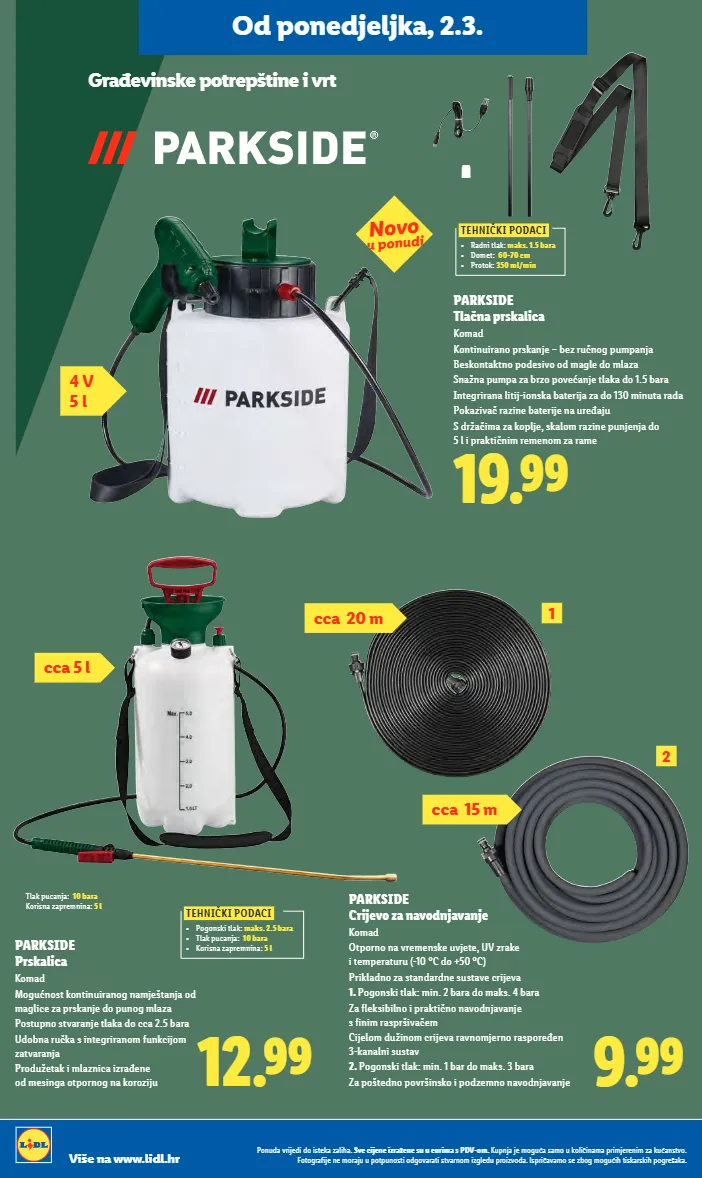 p arkside tlačna prskalica komad 4.99 parkside rukavice za vrt komad s protukliznim slojem lateksa veličine: 7-10 2.99 p arkside posuda za sadnju 4 komada u setu dimenzije: cca 38.5x35.5x63 cm 9.99 p arkside vrtni pribor komad od mesinga različite vrste 6.99 1100 w p arkside potopna pumpa za čistu vodu komad prikladna za malo zaprljanu vodu (promjer plutajućih tvari do 5 mm) plutajući prekidač za automatsko uključivanje i isključivanje s dovodnim kabelom dužine cca 10 m i najlonskim užetom dužine 8 m maks. dubina uranjanja: 7 m maks. visina ispumpavanja: 9 m maks. količina ispumpavanja: 20.000 l/h 49.99 cca 2 l od ponedjeljka, 2.3. još više proizvoda pronađi u posebnom izdanju vrtnog letka na lidl.hr 33 nac 10/2026 ponuda vrijedi do isteka zaliha. sve cijene izražene su u eurima s pdv-om. kupnja je moguća samo u količinama primjerenim za kućanstvo. fotografije ne moraju u potpunosti odgovarati stvarnom izgledu proizvoda. ispričavamo se zbog mogućih tiskarskih pogrešaka.