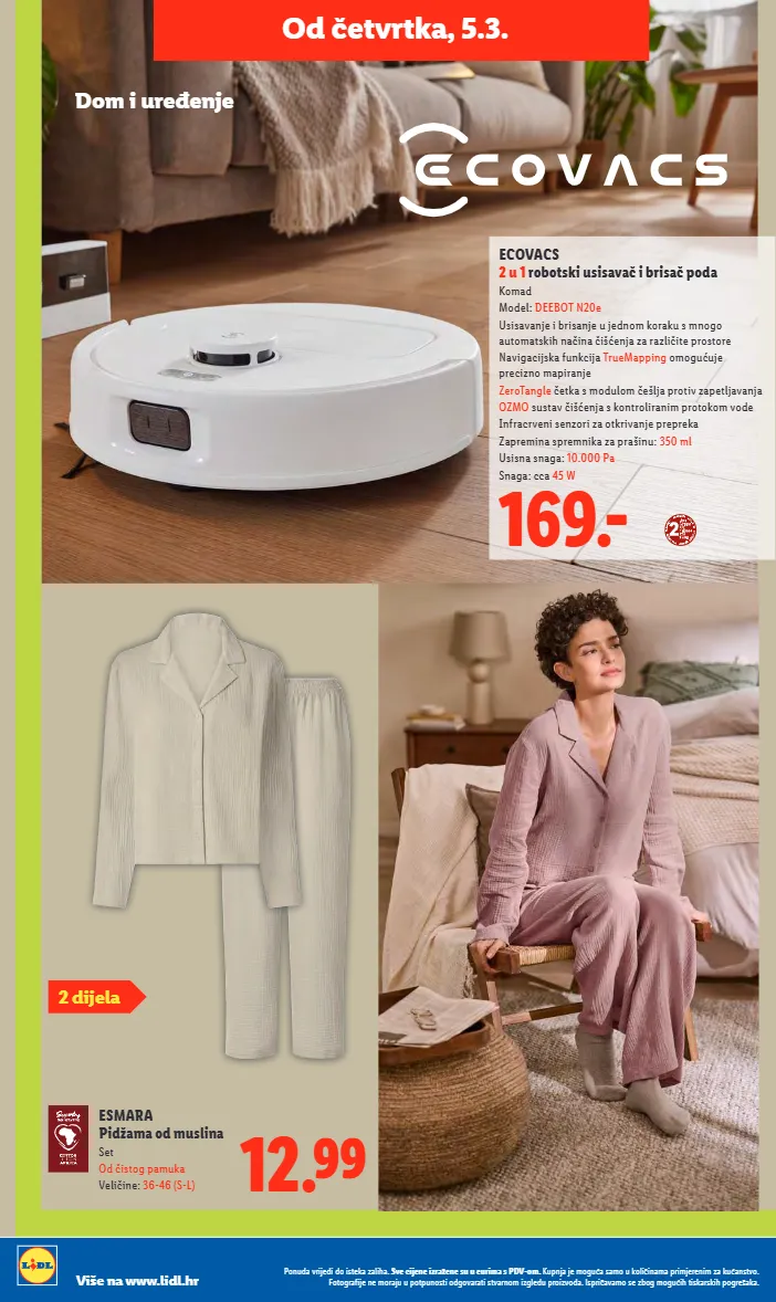 od četvrtka, 5.3. dom i uređenje 12.99 esmara pidžama od muslina set od čistog pamuka veličine: 36-46 (s-l) 2 dijela 169.- ecovacs 2 u 1 robotski usisavač i brisač poda komad model: deebot n20e usisavanje i brisanje u jednom koraku s mnogo automatskih načina čišćenja za različite prostore navigacijska funkcija truemapping omogućuje precizno mapiranje zerotangle četka s modulom češlja protiv zapetljavanja ozmo sustav čišćenja s kontroliranim protokom vode infracrveni senzori za otkrivanje prepreka zapremina spremnika za prašinu: 350 ml usisna snaga: 10.000 pa snaga: cca 45 w ponuda vrijedi do isteka zaliha. sve cijene izražene su u eurima s pdv-om. kupnja je moguća samo u količinama primjerenim za kućanstvo. fotografije ne moraju u potpunosti odgovarati stvarnom izgledu proizvoda. ispričavamo se zbog mogućih tiskarskih pogrešaka. više na www.lidl.hr