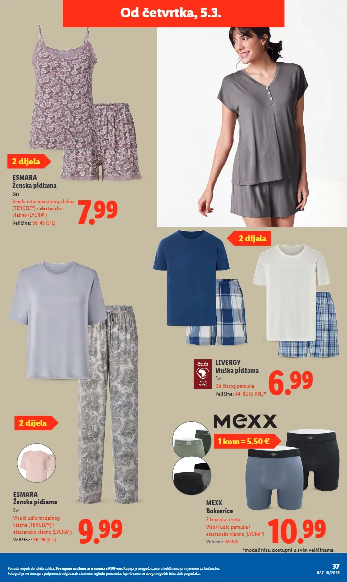 *modeli nisu dostupni u svim veličinama od četvrtka, 5.3. 7.99 esmara ženska pidžama set visoki udio modalnog vlakna (tencel™) i elastansko vlakno (lycra ® ) veličine: 36-46 (s-l) 2 dijela 9.99 esmara ženska pidžama set visoki udio modalnog vlakna (tencel™) i elastansko vlakno (lycra ® ) veličine: 36-46 (s-l) 2 dijela 2 dijela 6.99 livergy muška pidžama set od čistog pamuka veličine: 44-62 (s-xxl)* 10.99 mexx bokserice 2 komada u setu visoki udio pamuka i elastansko vlakno (lycra ® ) veličine: m-xxl 1 kom = 5.50 € 37 nac 10/2026 ponuda vrijedi do isteka zaliha. sve cijene izražene su u eurima s pdv-om. kupnja je moguća samo u količinama primjerenim za kućanstvo. fotografije ne moraju u potpunosti odgovarati stvarnom izgledu proizvoda. ispričavamo se zbog mogućih tiskarskih pogrešaka.