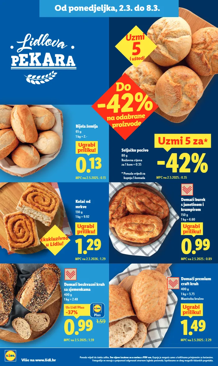 0.13 ugrabi priliku! mpc na 2.5.2025.: 0.13 bijela žemlja 65 g 1 kg = 2.- domaći burek s junetinom i krumpirom 150 g 1 kg = 6.60 domaći premium craft kruh 400 g 1 kg = 3.73 manitoba brašno 1.49 ugrabi priliku! mpc na 2.5.2025.: 2.29 0.99 ugrabi priliku! mpc na 2.5.2025.: 0.89 do -42% na odabrane proizvode od ponedjeljka, 2.3. do 8.3. domaći beskvasni kruh sa sjemenkama 400 g 1 kg = 2.48 1.29 ugrabi priliku! mpc na 2.3.2026.: 1.29 kolač od mrkve 130 g 1 kg = 9.92 * ponuda vrijedi za kupnju 5 komada uzmi 5 i uštedi seljačko pecivo 80 g redovna cijena za 1 kom = 0.35 1.59 0.99 -37% uz lidl plus mpc na 2.5.2025.: 1.59 uzmi 5 za * -42% mpc na 2.5.2025.: 0.35 ekskluzivno u lidlu! ponuda vrijedi do isteka zaliha. sve cijene izražene su u eurima s pdv-om. kupnja je moguća samo u količinama primjerenim za kućanstvo. fotografije ne moraju u potpunosti odgovarati stvarnom izgledu proizvoda. ispričavamo se zbog mogućih tiskarskih pogrešaka. više na www.lidl.hr