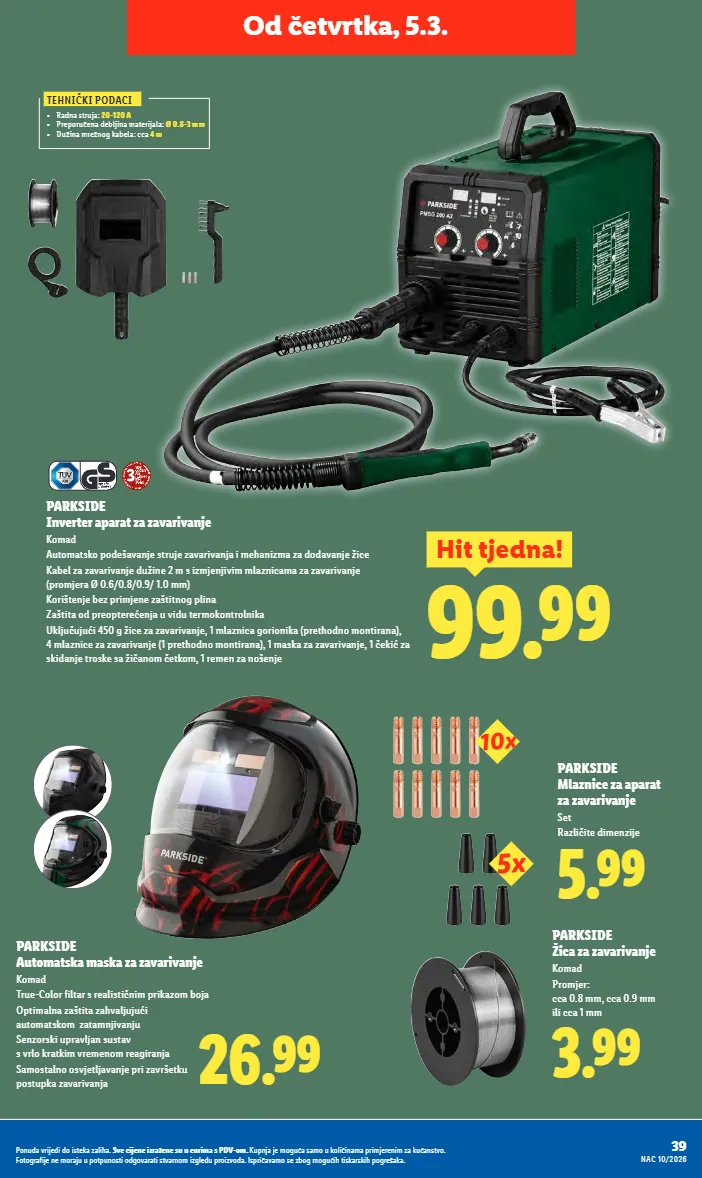99.99 H it tjedna ! PARKSIDE Inverter aparat za zavarivanje Komad Automatsko podešavanje struje zavarivanja i mehanizma za dodavanje žice Kabel za zavarivanje dužine 2 m s izmjenjivim mlaznicama za zavarivanje (promjera Ø 0.6/0.8/0.9/ 1.0 mm) Korištenje bez primjene zaštitnog plina Zaštita od preopterećenja u vidu termokontrolnika Uključujući 450 g žice za zavarivanje, 1 mlaznica gorionika (prethodno montirana), 4 mlaznice za zavarivanje (1 prethodno montirana), 1 maska za zavarivanje, 1 čekić za skidanje troske sa žičanom četkom, 1 remen za nošenje P ARKSIDE Automatska maska za zavarivanje Komad True-Color filtar s realističnim prikazom boja Optimalna zaštita zahvaljujući automatskom zatamnjivanju Senzorski upravljan sustav s vrlo kratkim vremenom reagiranja Samostalno osvjetljavanje pri završetku postupka zavarivanja 26.99 TEHNIČKI PODACI • Radna struja: 20-120 A • Preporučena debljina materijala: Ø 0.8-3 mm • Dužina mrežnog kabela: cca 4 m P ARKSIDE Mlaznice za aparat za zavarivanje Set Različite dimenzije 5.99 5x 10x P ARKSIDE Žica za zavarivanje Komad Promjer: cca 0.8 mm, cca 0.9 mm ili cca 1 mm 3.99 Od četvrtka, 5.3. 39 NAC 10/2026 Ponuda vrijedi do isteka zaliha. Sve cijene izražene su u eurima s PDV-om. Kupnja je moguća samo u količinama primjerenim za kućanstvo. Fotografije ne moraju u potpunosti odgovarati stvarnom izgledu proizvoda. Ispričavamo se zbog mogućih tiskarskih pogrešaka.