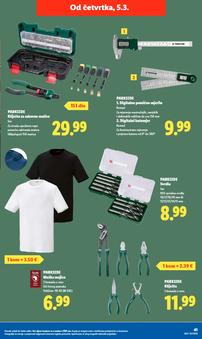P ARKSIDE Svrdla Set HSS sprialna svrdla 16/17/18/20 mm ili 11/12/13/14/15 mm 8.99 P ARKSIDE Kliješta za zakovne matice Set Za izradu upuštene rupe pomoću zakivanja matica Uključujući 150 matica 29.99 151 dio P ARKSIDE 1. Digitalno pomično mjerilo Komad Za mjerenje unutrašnjih, vanjskih i dubinskih veličina do cca 150 mm 2. Digitalni kutomjer Komad Za kontinuirano mjerenje i prijenos kuteva od 0° do 360° 9.99 6.99 P ARKSIDE Muška majice 2 komada u setu Od čistog pamuka Veličine: 48-62 (M-XXL) P ARKSIDE Kliješta 5 komada u setu 11.99 1 kom = 2.39 € 1 kom = 3.50 € 1 2 Od četvrtka, 5.3. 41 NAC 10/2026 Ponuda vrijedi do isteka zaliha. Sve cijene izražene su u eurima s PDV-om. Kupnja je moguća samo u količinama primjerenim za kućanstvo. Fotografije ne moraju u potpunosti odgovarati stvarnom izgledu proizvoda. Ispričavamo se zbog mogućih tiskarskih pogrešaka.