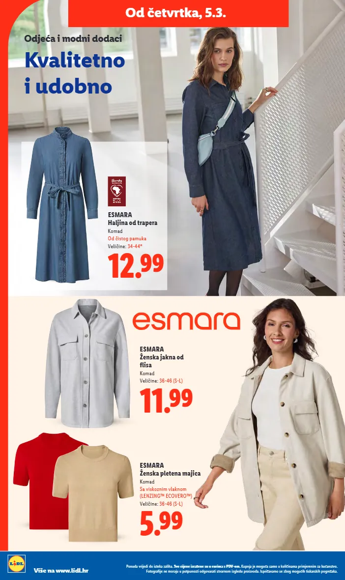 od četvrtka, 5.3. kvalitetno i udobno odjeća i modni dodaci 12.99 esmara haljina od trapera komad od čistog pamuka veličine: 34-44* 11.99 esmara ženska jakna od flisa komad veličine: 36-46 (s-l) 5.99 esmara ženska pletena majica komad sa viskoznim vlaknom (lenzing™ ecovero™) veličine: 36-46 (s-l) ponuda vrijedi do isteka zaliha. sve cijene izražene su u eurima s pdv-om. kupnja je moguća samo u količinama primjerenim za kućanstvo. fotografije ne moraju u potpunosti odgovarati stvarnom izgledu proizvoda. ispričavamo se zbog mogućih tiskarskih pogrešaka. više na www.lidl.hr