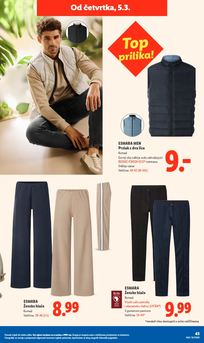 top prilika ! od četvrtka, 5.3. esmara men prsluk s dva lica komad gornji sloj odbija vodu zahvaljujući bionic-finish eco® tretmanu odbija vjetar veličine: 48-62 (m-xxl) 8.99 esmara ženske hlače komad veličine: 36-46 (s-l) 9.99 esmara ženske hlače komad visoki udio pamuka i elastansko vlakno (lycra®) s gumenom pasicom veličina: 34-44* *modeli nisu dostupni u svim veličinama 9.- 43 nac 10/2026 ponuda vrijedi do isteka zaliha. sve cijene izražene su u eurima s pdv-om. kupnja je moguća samo u količinama primjerenim za kućanstvo. fotografije ne moraju u potpunosti odgovarati stvarnom izgledu proizvoda. ispričavamo se zbog mogućih tiskarskih pogrešaka.