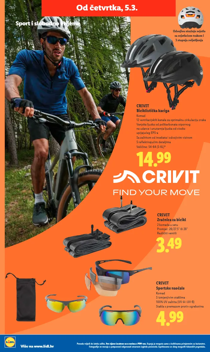 sport i slobodno vrijeme 4.99 crivit sportske naočale komad s izmjenjivim staklima 100% uv zaštita (uv-a i uv-b) stakla s premazom protiv ogrebotina 14.99 crivit biciklistička kaciga komad 12 ventilacijskih kanala za optimalnu cirkulaciju zraka vanjska ljuska od polikarbonata otpornog na udarce i unutarnja ljuska od visoko upijajućeg eps-a sa zaštitom od insekata i odvojivim vizirom s reflektirajućim detaljima veličine: 54-64 (s-xl)* 3.49 crivit zračnica za bicikl 2 komada u setu promjer: 26/27.5" ili 28" različiti ventili odvojivo stražnje svjetlo sa svjetlećom trakom i 3 stupnja svijetljenja od četvrtka, 5.3. ponuda vrijedi do isteka zaliha. sve cijene izražene su u eurima s pdv-om. kupnja je moguća samo u količinama primjerenim za kućanstvo. fotografije ne moraju u potpunosti odgovarati stvarnom izgledu proizvoda. ispričavamo se zbog mogućih tiskarskih pogrešaka. više na www.lidl.hr