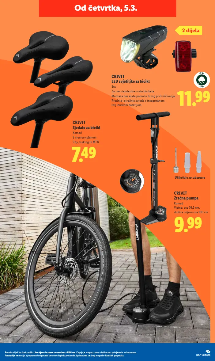 uključuje set adaptera 11.99 crivit led svjetiljke za bicikl set za sve standardne vrste bicikala montaža bez alata pomoću brzog pričvršćivanja prednje i stražnje svjetlo s integriranom litij ionskom baterijom 2 dijela 7.49 crivit sjedalo za bicikl komad s memory pjenom city, treking ili mtb 9.99 crivit zračna pumpa komad visina: cca 76.5 cm, dužina crijeva cca 100 cm i p 4 4 i p 4 4 od četvrtka, 5.3. 45 nac 10/2026 ponuda vrijedi do isteka zaliha. sve cijene izražene su u eurima s pdv-om. kupnja je moguća samo u količinama primjerenim za kućanstvo. fotografije ne moraju u potpunosti odgovarati stvarnom izgledu proizvoda. ispričavamo se zbog mogućih tiskarskih pogrešaka.