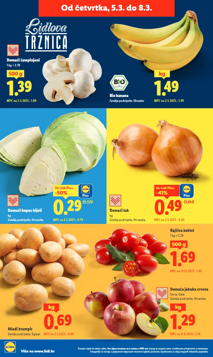 ponuda vrijedi do isteka zaliha. sve cijene izražene su u eurima s pdv-om. kupnja je moguća samo u količinama primjerenim za kućanstvo. fotografije ne moraju u potpunosti odgovarati stvarnom izgledu proizvoda. ispričavamo se zbog mogućih tiskarskih pogrešaka. više na www.lidl.hr od četvrtka, 5.3. do 8.3. mpc na 2.5.2025.: 0.79 0.59 0.29 -50% uz lidl plus domaći kupus bijeli kg zemlja podrijetla: hrvatska domaći luk kg zemlja podrijetla: hrvatska rajčica koktel 1 kg = 3.38 1.69 500 g mpc na 15.12.2025.: 1.49 1.39 500 g mpc na 2.5.2025.: 1.89 domaći šampinjoni 1 kg = 2.78 bio banana zemlja podrijetla: ekvador 1.49 kg mpc na 2.5.2025.: 1.99 mpc na 2.5.2025.: 0.84 0.84 0.49 -41% uz lidl plus mladi krumpir zemlja podrijetla: egipat 0.69 kg mpc na 2.5.2025.: 0.99 domaća jabuka crvena sorta: gala zemlja podrijetla: hrvatska 1.29 kg mpc na 11.8.2025.: 1.79