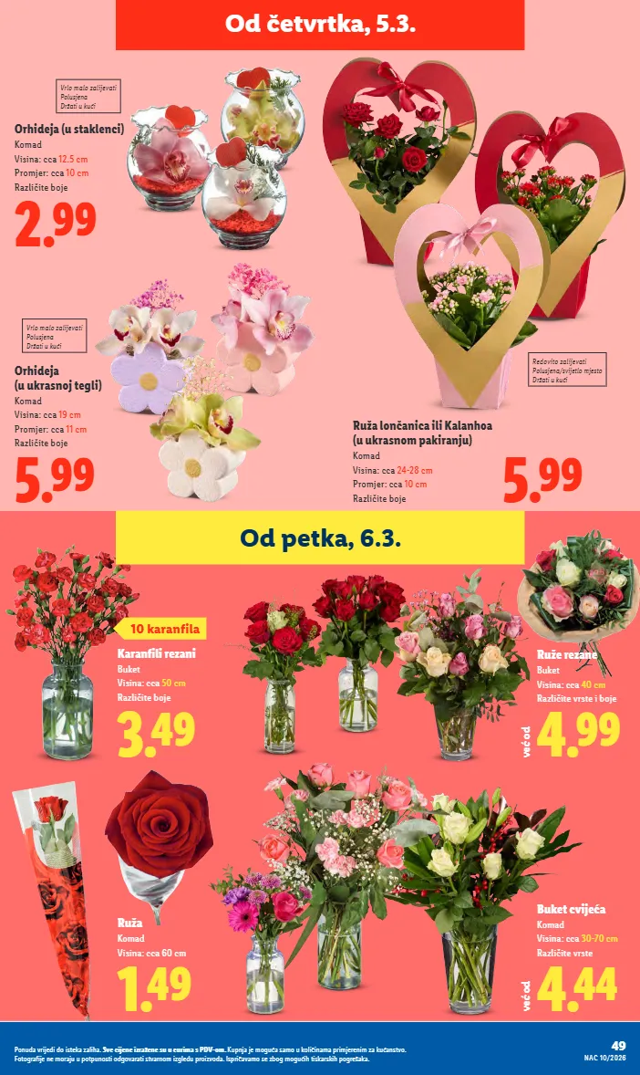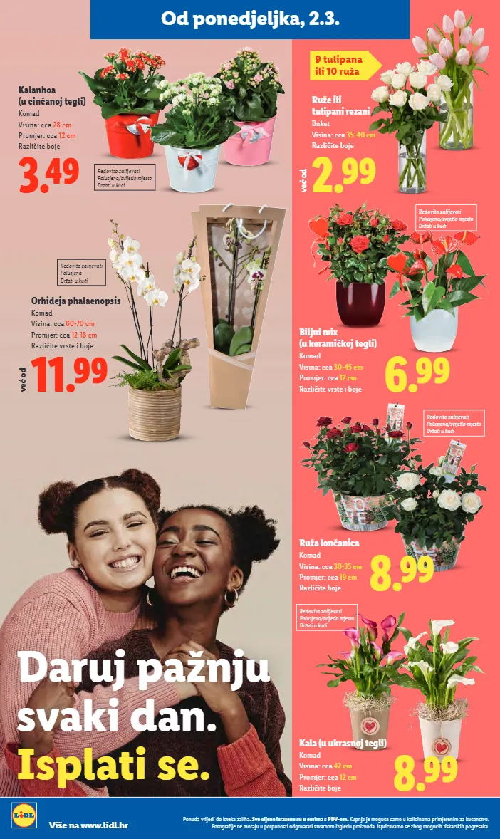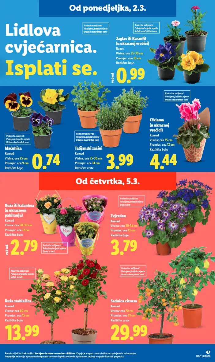 ponuda vrijedi do isteka zaliha. sve cijene izražene su u eurima s pdv-om. kupnja je moguća samo u količinama primjerenim za kućanstvo. fotografije ne moraju u potpunosti odgovarati stvarnom izgledu proizvoda. ispričavamo se zbog mogućih tiskarskih pogrešaka. lidlova cvjećarnica. isplati se. od ponedjeljka, 2.3. redovito zalijevati polusjena/svijetlo mjesto držati u kući/držati vani 0.74 maćuhica komad visina: cca 25 cm promjer: cca 9 cm različite boje redovito zalijevati polusjena/svijetlo mjesto držati u kući 3.79 zvjezdan komad visina: cca 30-35 cm promjer: cca 13 cm različite boje 29.99 sadnica citrusa komad visina: cca 70 cm promjer: cca 21 cm različite vrste 13.99 ruža stablašica komad visina: cca 60 cm promjer: cca 15 cm različite boje redovito zalijevati polusjena/svijetlo mjesto držati vani redovito zalijevati polusjena/svijetlo mjesto držati u kući/držati vani 47 nac 10/2026 ponuda vrijedi do isteka zaliha. sve cijene izražene su u eurima s pdv-om. kupnja je moguća samo u količinama primjerenim za kućanstvo. fotografije ne moraju u potpunosti odgovarati stvarnom izgledu proizvoda. ispričavamo se zbog mogućih tiskarskih pogrešaka. redovito zalijevati polusjena/svijetlo mjesto držati u kući/držati vani jaglac ili karanfil (u ukrasnoj vrećici) buket visina: cca 25-30 cm promjer: cca 10 cm različite boje 0.99 već od redovito zalijevati polusjena/svijetlo mjesto držati u kući/držati vani 4.44 ciklama (u ukrasnoj vrećici) komad visina: cca 35 cm promjer: cca 12 cm različite boje redovito zalijevati polusjena/svijetlo mjesto držati u kući/držati vani od četvrtka, 5.3. ruža ili kalanhoa (u ukrasnom pakiranju) komad visina: cca 28-30 cm promjer: cca 12 cm različite boje 2.79 već od redovito zalijevati polusjena/svijetlo mjesto držati u kući redovito zalijevati polusjena/svijetlo mjesto držati u kući/držati vani 3.99 talijanski začini komad visina: cca 25-30 cm promjer: cca 14 cm različite vrste