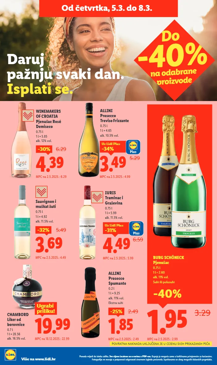 chambord liker od borovnice 0.7 l 1 l = 28.56 alk. 16.5% vol. 3.69 -32% 5.49 mpc na 2.5.2025.: 4.49 sauvignon i muškat žuti 0.75 l 1 l = 4.92 alk. 11.5% vol. iuris traminac i graševina 0.75 l 1 l = 5.99 alk. 11.5% vol. 1.85 -25% 2.49 mpc na 2.5.2025.: 2.49 allini prosecco spumante 0.2 l 1 l = 9.25 alk. 11% vol. ekstra suhi winemakers of croatia pjenušac ros é demiseco 0.75 l 1 l = 5.85 alk. 12% vol. 4.39 -30% 6.29 mpc na 2.5.2025.: 6.29 1.95 3.29 burg schöneck pjenušac 0.75 l 1 l = 2.60 alk. 11% vol. suhi ili polusuhi mpc na 2.5.2025.: 2.99 -40% allini prosecco treviso frizzante 0.75 l 1 l = 4.65 alk. 10.5% vol. 6.59 4.49 -31% uz lidl plus mpc na 2.5.2025.: 5.99 do -40% na odabrane proizvode daruj pažnju svaki dan. isplati se. 5.29 3.49 -34% uz lidl plus mpc na 2.5.2025.: 4.99 19.99 ugrabi priliku! mpc na 18.12.2025.: 22.99 povratna naknada uključena je u cijenu svih prikazanih pića ponuda vrijedi do isteka zaliha. sve cijene izražene su u eurima s pdv-om. kupnja je moguća samo u količinama primjerenim za kućanstvo. fotografije ne moraju u potpunosti odgovarati stvarnom izgledu proizvoda. ispričavamo se zbog mogućih tiskarskih pogrešaka. više na www.lidl.hr od četvrtka, 5.3. do 8.3.