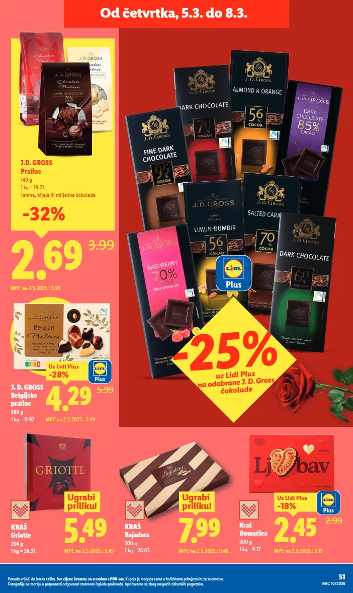 5.49 ugrabi priliku! mpc na 2.5.2025.: 5.49 kraš griotte 204 g 1 kg = 26.91 kraš bajadera 300 g 1 kg = 26.63 2.69 3.99 j.d. gross praline 140 g 1 kg = 19.21 tamna, bijela ili mliječna čokolada mpc na 2.5.2025.: 3.99 -32% 7.99 ugrabi priliku! mpc na 2.5.2025.: 9.49 kraš domaćica 300 g 1 kg = 8.17 -25% uz lidl plus na odabrane j. d. gross čokolade 18726 j. d. gross belgijske praline 360 g 1 kg = 11.92 5.99 4.29 -28% uz lidl plus mpc na 2.5.2025.: 5.49 2.99 2.45 -18% uz lidl plus mpc na 2.5.2025.: 3.19 51 nac 10/2026 ponuda vrijedi do isteka zaliha. sve cijene izražene su u eurima s pdv-om. kupnja je moguća samo u količinama primjerenim za kućanstvo. fotografije ne moraju u potpunosti odgovarati stvarnom izgledu proizvoda. ispričavamo se zbog mogućih tiskarskih pogrešaka. od četvrtka, 5.3. do 8.3.