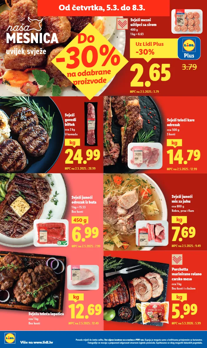 svježi juneći mix za juhu cca 800 g rebra, prsa i flam 7.69 kg mpc na 2.5.2025.: 9.49 12.69 kg mpc na 2.5.2025.: 12.49 svježi juneći odrezak iz buta 1 kg = 15.53 bez kosti uz lidl plus -30% 2.65 3.79 mpc na 2.5.2025.: 3.79 svježa teleća lopatica cca 1 kg bez kosti 24.99 kg mpc na 2.5.2025.: 28.99 svježi goveđi biftek cca 2 kg u komadu 5.99 kg mpc na 5.3.2026.: 5.99 porchetta marinirano rolano carsko meso cca 1 kg bez kosti i s kožom do -30% na odabrane proizvode 6.99 450 g mpc na 2.5.2025.: 7.99 14.79 kg mpc na 2.5.2025.: 12.99 svježi teleći kare odrezak cca 500 g s kosti svježi mesni uštipci sa sirom 400 g 1 kg = 6.63 od četvrtka, 5.3. do 8.3. ponuda vrijedi do isteka zaliha. sve cijene izražene su u eurima s pdv-om. kupnja je moguća samo u količinama primjerenim za kućanstvo. fotografije ne moraju u potpunosti odgovarati stvarnom izgledu proizvoda. ispričavamo se zbog mogućih tiskarskih pogrešaka. više na www.lidl.hr