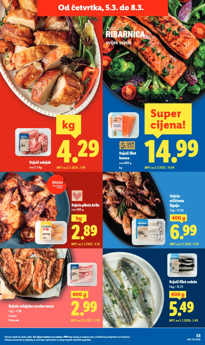 svježa pileća krila cca 500 g svježe svinjsko carsko meso 1 kg = 4.98 s kosti odrezak 6.99 400 g mpc na 2.5.2025.: 9.99 2.99 600 g mpc na 2.5.2025.: 3.99 14.99 mpc na 3.7.2025.: 14.99 super cijena! svježa očišćena lignja 1 kg = 17.48 svježi odojak cca 2.3 kg 2.89 kg mpc na 2.5.2025.: 4.19 4.29 mpc na 2.5.2025.: 7.99 kg svježi filet lososa cca 600 g kg s vježi filet srdele 1 kg = 13.73 5.49 400 g mpc na 5.3.2026.: 5.49 od četvrtka, 5.3. do 8.3. 53 nac 10/2026 ponuda vrijedi do isteka zaliha. sve cijene izražene su u eurima s pdv-om. kupnja je moguća samo u količinama primjerenim za kućanstvo. prikazani proizvodi su prijedlog za serviranje. ispričavamo se zbog mogućih tiskarskih pogrešaka.