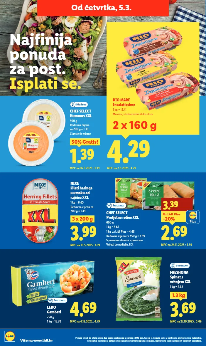 freshona špinat s vrhnjem xxl 1 kg = 2.84 nixe fileti haringe u umaku od rajčice xxl 1 kg = 6.65 redovna cijena za 200 g = 1.49 3.99 3 x 200 g mpc na 15.5.2025.: 4.19 chef select proljetne rolice xxl 600 g 1 kg = 5.65 1 kg uz lidl plus = 4.48 redovna cijena za 450 g = 3.99 s povrćem ili mini s povrćem vrijedi do nedjelje, 8.3. 1.39 50% gratis! mpc na 16.5.2025.: 1.39 chef select hummus xxl 300 g redovna cijena za 200 g = 1.39 classic ili pikant 4.29 mpc na 2.5.2025.: 4.29 2 x 160 g rio mare insalatissime 1 kg = 13.41 mexico, s kukuruzom ili kus kus najfinija ponuda za post. isplati se. 4.69 mpc na 4.12.2025.: 4.79 ledo gamberi 250 g 1 kg = 18.76 3.69 1.3 kg mpc na 27.10.2025.: 3.69 2.69 3.39 mpc na 24.11.2025.: 3.39 -20% uz lidl plus ponuda vrijedi do isteka zaliha. sve cijene izražene su u eurima s pdv-om. kupnja je moguća samo u količinama primjerenim za kućanstvo. fotografije ne moraju u potpunosti odgovarati stvarnom izgledu proizvoda. ispričavamo se zbog mogućih tiskarskih pogrešaka. više na www.lidl.hr od četvrtka, 5.3.