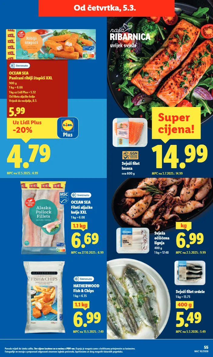 s vježi filet srdele 1 kg = 13.73 5.49 400 g mpc na 5.3.2026.: 5.49 ocean sea fileti aljaške kolje xxl 1 kg = 6.08 6.69 1.1 kg mpc na 27.10.2025.: 6.99 6.99 1.1 kg mpc na 15.5.2025.: 7.49 hatherwood fish & chips 1 kg = 6.35 14.99 mpc na 3.7.2025.: 14.99 super cijena! svježi filet lososa cca 600 g uz lidl plus -20% 4.79 mpc na 12.5.2025.: 6.99 5.99 ocean sea panirani riblji štapići xxl 900 g 1 kg = 6.66 1 kg uz lidl plus = 5.32 od fileta aljaške kolje vrijedi do nedjelje, 8.3. svježa očišćena lignja 400 g 1 kg = 17.48 6.99 kg mpc na 2.5.2025.: 9.99 55 nac 10/2026 ponuda vrijedi do isteka zaliha. sve cijene izražene su u eurima s pdv-om. kupnja je moguća samo u količinama primjerenim za kućanstvo. fotografije ne moraju u potpunosti odgovarati stvarnom izgledu proizvoda. ispričavamo se zbog mogućih tiskarskih pogrešaka. od četvrtka, 5.3.