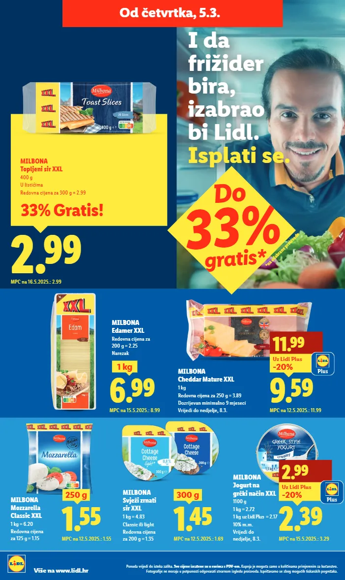 i da frižider bira, izabrao bi lidl. isplati se. milbona edamer xxl redovna cijena za 200 g = 2.25 narezak 6.99 1 kg mpc na 15.5.2025.: 8.99 milbona j ogurt na grčki način xxl 1100 g 1 kg = 2.72 1 kg uz lidl plus = 2.17 10% m.m. vrijedi do nedjelje, 8.3. milbona svježi zrnati sir xxl 1 kg = 4.83 classic ili light redovna cijena za 200 g = 1.35 milbona mozzarella classic xxl 1 kg = 6.20 redovna cijena za 125 g = 1.15 1.55 250 g mpc na 12.5.2025.: 1.55 9.59 11.99 mpc na 12.5.2025.: 11.99 -20% uz lidl plus 2.99 mpc na 16.5.2025.: 2.99 33% gratis! milbona topljeni sir xxl 400 g u listićima redovna cijena za 300 g = 2.99 1.45 300 g mpc na 12.5.2025.: 1.69 milbona cheddar mature xxl 1 kg redovna cijena za 250 g = 3. 8 9 dozrijevan minimalno 9 mjeseci vrijedi do nedjelje, 8.3. 2.39 2.99 mpc na 15.5.2025.: 3.29 -20% uz lidl plus do 33% gratis* *na odabrane proizvode ponuda vrijedi do isteka zaliha. sve cijene izražene su u eurima s pdv-om. kupnja je moguća samo u količinama primjerenim za kućanstvo. fotografije ne moraju u potpunosti odgovarati stvarnom izgledu proizvoda. ispričavamo se zbog mogućih tiskarskih pogrešaka. više na www.lidl.hr od četvrtka, 5.3.