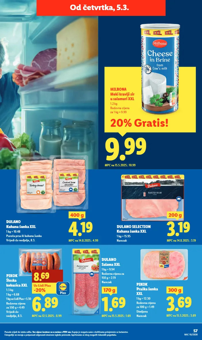 dulano salama xxl 1 kg = 9.94 redovna cijena za 150 g = 2.19 narezak 1.69 170 g mpc na 15.5.2025.: 1.69 3.19 200 g mpc na 14.8.2025.: 3.19 dulano selection kuhana šunka xxl 1 kg = 15.95 narezak 4.19 400 g mpc na 14.8.2025.: 4.99 9.99 mpc na 15.5.2025.: 10.99 20% gratis! milbona meki kravlji sir u salamuri xxl 1.2 kg redovna cijena za 1 kg = 9.99 pikok praška šunka xxl 1 kg = 12.30 redovna cijena za 100 g = 1.49 dimljena narezak 3.69 300 g mpc na 15.5.2025.: 3.69 dulano kuhana šunka xxl 1 kg = 10.48 pureća prsa ili kuhana šunka vrijedi do nedjelje, 8.3. pikok šleska kobasica xxl 1.3 kg 1 kg = 6.68 1 kg uz lidl plus = 5.30 redovna cijena za 550 g = 4.49 vrijedi do nedjelje, 8.3. 6.89 8.69 mpc na 12.5.2025.: 8.99 -20% uz lidl plus 57 nac 10/2026 ponuda vrijedi do isteka zaliha. sve cijene izražene su u eurima s pdv-om. kupnja je moguća samo u količinama primjerenim za kućanstvo. fotografije ne moraju u potpunosti odgovarati stvarnom izgledu proizvoda. ispričavamo se zbog mogućih tiskarskih pogrešaka. od četvrtka, 5.3.