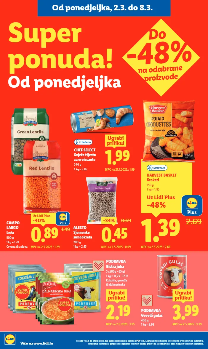super ponuda! od ponedjeljka do -48% na odabrane proizvode 3.99 ugrabi priliku! mpc na 2.5.2025.: 3.39 podravka goveđi gulaš 400 g 1 kg = 9.98 podravka bistra juha 3 x (60g - 65 g) 1 kg = 11,23 - 12.17 kokošja, goveđa ili dalmatinska 2.19 ugrabi priliku! mpc na 2.5.2025.: 1.95 0.45 -34% 0.69 mpc na 2.5.2025.: 0.69 alesto s jemenke suncokreta 200 g 1 kg = 2.45 11159 uz lidl plus -48% 1.39 2.69 harvest basket kroketi 750 g 1 kg = 1.85 mpc na 2.5.2025.: 2.69 1.49 0.89 -40% uz lidl plus mpc na 2.5.2025.: 1.29 campo largo leća 500 g 1 kg = 1.78 crvena ili zelena chef select svježe tijesto za croissante 340 g 1 kg = 5.85 1.99 ugrabi priliku! mpc na 21.7.2025.: 1.99 ponuda vrijedi do isteka zaliha. sve cijene izražene su u eurima s pdv-om. kupnja je moguća samo u količinama primjerenim za kućanstvo. fotografije ne moraju u potpunosti odgovarati stvarnom izgledu proizvoda. ispričavamo se zbog mogućih tiskarskih pogrešaka. više na www.lidl.hr od ponedjeljka, 2.3. do 8.3.