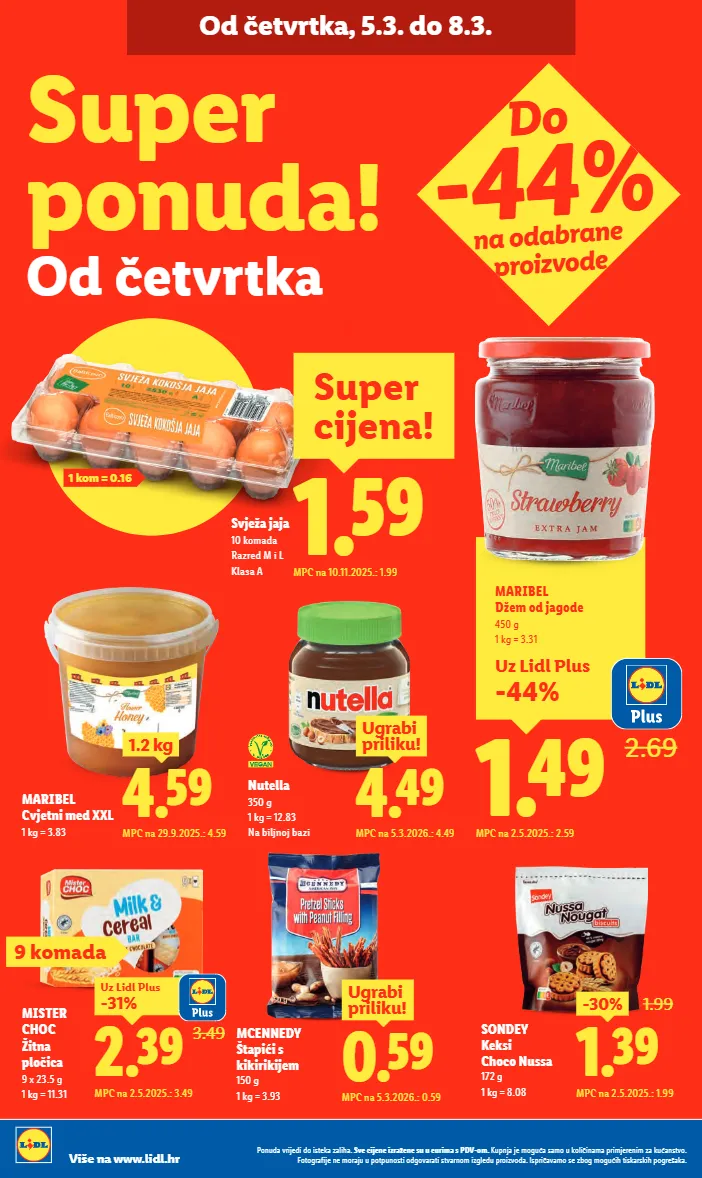 super ponuda! od četvrtka do -44% na odabrane proizvode maribel cvjetni med xxl 1 kg = 3.83 svježa jaja 10 komada razred m i l klasa a 4.59 1.2 kg mpc na 29.9.2025.: 4.59 uz lidl plus -44% 1.49 2.69 maribel d žem od jagode 450 g 1 kg = 3.31 mpc na 2.5.2025.: 2.59 mister choc žitna pločica 9 x 23.5 g 1 kg = 11.31 sondey keksi choco nussa 172 g 1 kg = 8.08 mcennedy štapići s kikirikijem 150 g 1 kg = 3.93 3.49 2.39 -31% uz lidl plus mpc na 2.5.2025.: 3.49 1.39 -30% 1.99 mpc na 2.5.2025.: 1.99 4.49 ugrabi priliku! mpc na 5.3.2026.: 4.49 n utella 350 g 1 kg = 12.83 na biljnoj bazi 9 komada 0.59 ugrabi priliku! mpc na 5.3.2026.: 0.59 1 kom = 0.16 1.59 mpc na 10.11.2025.: 1.99 super cijena! od četvrtka, 5.3. do 8.3. ponuda vrijedi do isteka zaliha. sve cijene izražene su u eurima s pdv-om. kupnja je moguća samo u količinama primjerenim za kućanstvo. fotografije ne moraju u potpunosti odgovarati stvarnom izgledu proizvoda. ispričavamo se zbog mogućih tiskarskih pogrešaka. više na www.lidl.hr