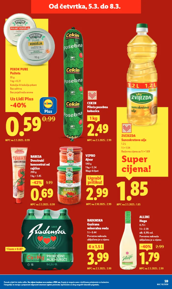 1.85 mpc na 2.5.2025.: 1.85 super cijena! zvijezda suncokretovo ulje 1.2 l 1 l = 1.54 redovna cijena za 1 l = 1.69 uz lidl plus -40% 0.59 0.99 pikok pure pašteta 95 g 1 kg = 6.21 kokošja ili kokošja pikant bez aditiva bez pojačivača arome mpc na 2.5.2025.: 0.99 2.49 1 kg mpc na 2.5.2025.: 2.99 cekin pileća posebna kobasica 2.99 ugrabi priliku! mpc na 2.10.2025.: 2.99 vipro ajvar 540 g 1 kg = 5.54 blagi ili ljuti 1.79 -40% 2.99 mpc na 2.5.2025.: 2.99 allini hugo 0.75 l 1 l = 2.39 alk. 6,9% vol. povratna naknada uključena je u cijenu baresa dvostruki koncentrat od rajčice 200 g 1 kg = 3.45 0.69 -42% 1.19 mpc na 2.5.2025.: 0.99 3.99 6 x 1.5 l mpc na 2.5.2025.: 3.99 radenska gazirana mineralna voda 1 l = 0.44 povratna naknada uključena je u cijenu 1 kom = 0.67 od četvrtka, 5.3. do 8.3. 59 nac 10/2026 ponuda vrijedi do isteka zaliha. sve cijene izražene su u eurima s pdv-om. kupnja je moguća samo u količinama primjerenim za kućanstvo. fotografije ne moraju u potpunosti odgovarati stvarnom izgledu proizvoda. ispričavamo se zbog mogućih tiskarskih pogrešaka.