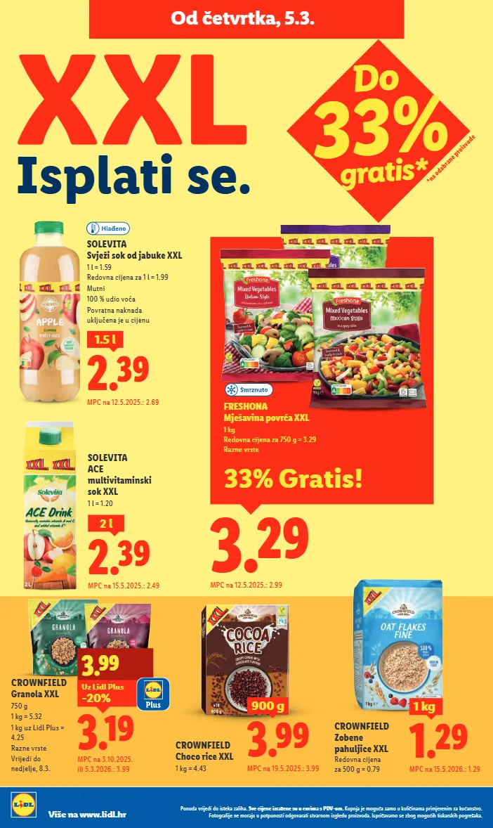 XXL Isplati se. SOLEVITA ACE multivitaminski sok XXL 1 l = 1.20 2.39 1.5 l MPC na 12.5.2025.: 2.69 CROWNFIELD Choco rice XXL 1 kg = 4.43 3.99 900 g MPC na 19.5.2025.: 3.99 3.29 FRESHONA Mješavina povrća XXL 1 kg Redovna cijena za 750 g = 3.29 Razne vrste MPC na 12.5.2025.: 2.99 33% Gratis! Do 33% gratis* *na odabrane proizvode SOLEVITA Svježi sok od jabuke XXL 1 l = 1.59 Redovna cijena za 1 l = 1.99 Mutni 100 % udio voća Povratna naknada uključena je u cijenu CROWNFIELD Zobene pahuljice XXL Redovna cijena za 500 g = 0.79 1.29 1 kg MPC na 15.5.2026.: 1.29 2.39 2 l MPC na 15.5.2025.: 2.49 CROWNFIELD Granola XXL 750 g 1 kg = 5.32 1 kg uz Lidl Plus = 4.25 Razne vrste Vrijedi do nedjelje, 8.3. 3.19 3.99 MPC na 3.10.2025. ili 5.3.2026.: 3.99 -20% Uz Lidl Plus Ponuda vrijedi do isteka zaliha. Sve cijene izražene su u eurima s PDV-om. Kupnja je moguća samo u količinama primjerenim za kućanstvo. Fotografije ne moraju u potpunosti odgovarati stvarnom izgledu proizvoda. Ispričavamo se zbog mogućih tiskarskih pogrešaka. Više na www.lidl.hr Od četvrtka, 5.3.