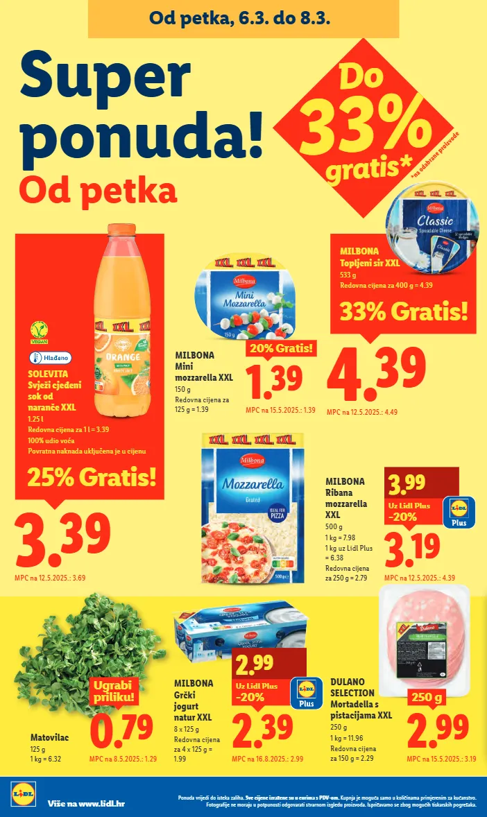 super ponuda! od petka 2.99 250 g mpc na 15.5.2025.: 3.19 dulano selection mortadella s pistacijama xxl 250 g 1 kg = 11.96 redovna cijena za 150 g = 2.29 milbona mini mozzarella xxl 150 g redovna cijena za 125 g = 1.39 1.39 20% gratis! mpc na 15.5.2025.: 1.39 milbona grčki jogurt natur xxl 8 x 125 g redovna cijena za 4 x 125 g = 1.99 2.39 2.99 mpc na 16.8.2025.: 2.99 -20% uz lidl plus milbona ribana mozzarella xxl 500 g 1 kg = 7.98 1 kg uz lidl plus = 6.38 redovna cijena za 250 g = 2.79 3.19 3.99 mpc na 12.5.2025.: 4.39 -20% uz lidl plus 183888 3.39 mpc na 12.5.2025.: 3.69 25% gratis! solevita svježi cjeđeni sok od naranče xxl 1.25 l redovna cijena za 1 l = 3.39 100% udio voća povratna naknada uključena je u cijenu 4.39 mpc na 12.5.2025.: 4.49 33% gratis! milbona topljeni sir xxl 533 g redovna cijena za 400 g = 4.39 do 33% gratis* *na odabrane proizvode matovilac 125 g 1 kg = 6.32 0.79 ugrabi priliku! mpc na 8.5.2025.: 1.29 ponuda vrijedi do isteka zaliha. sve cijene izražene su u eurima s pdv-om. kupnja je moguća samo u količinama primjerenim za kućanstvo. fotografije ne moraju u potpunosti odgovarati stvarnom izgledu proizvoda. ispričavamo se zbog mogućih tiskarskih pogrešaka. više na www.lidl.hr od petka, 6.3. do 8.3.